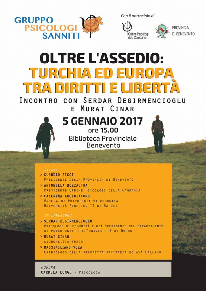L’appuntamento in programma che sarà aperto dai saluti del presidente della Provincia, Claudio Ricci, della presidente dell’Ordine degli Psicologi della Campania, Antonella Bozzaotra, e della docente di Psicologia di Comunità dell’università Federico II, Caterina Arcidiacono, sarà anche l’occasione per riflettere con Degirmencioglu e Cinar sulla situazione in Turchia, anche alla luce dell’attentato terroristico di Istanbul.