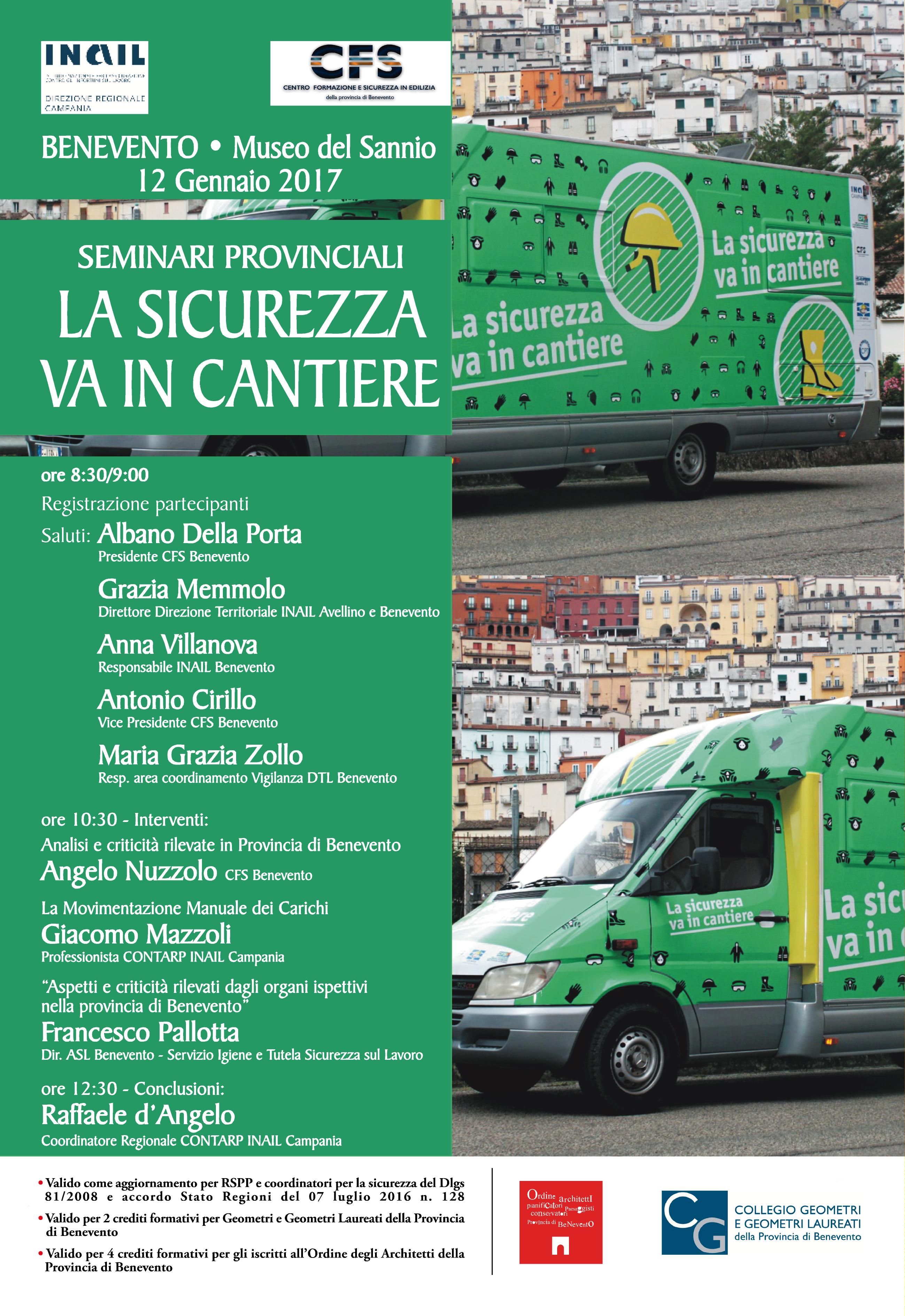 locandina-copiaProsegue l’attività del progetto “La Sicurezza va in cantiere”, promosso dalla Direzione Regionale Inail della Campania e dal Centro Formazione e Sicurezza in Edilizia di Benevento, con un seminario informativo, giovedì 12 gennaio 2017 dalle ore 8.30 presso il Museo del Sannio. Il seminario sarà l’occasione, attraverso gli interventi dei diversi relatori, per esaminare i diversi aspetti della sicurezza sui cantieri, dalla movimentazione manuale dei carichi agli aspetti e criticità rilevati dagli organi ispettivi nella provincia di Benevento, per approfondire quindi le analisi e criticità rilevate, sul tema, proprio nella nostra provincia.