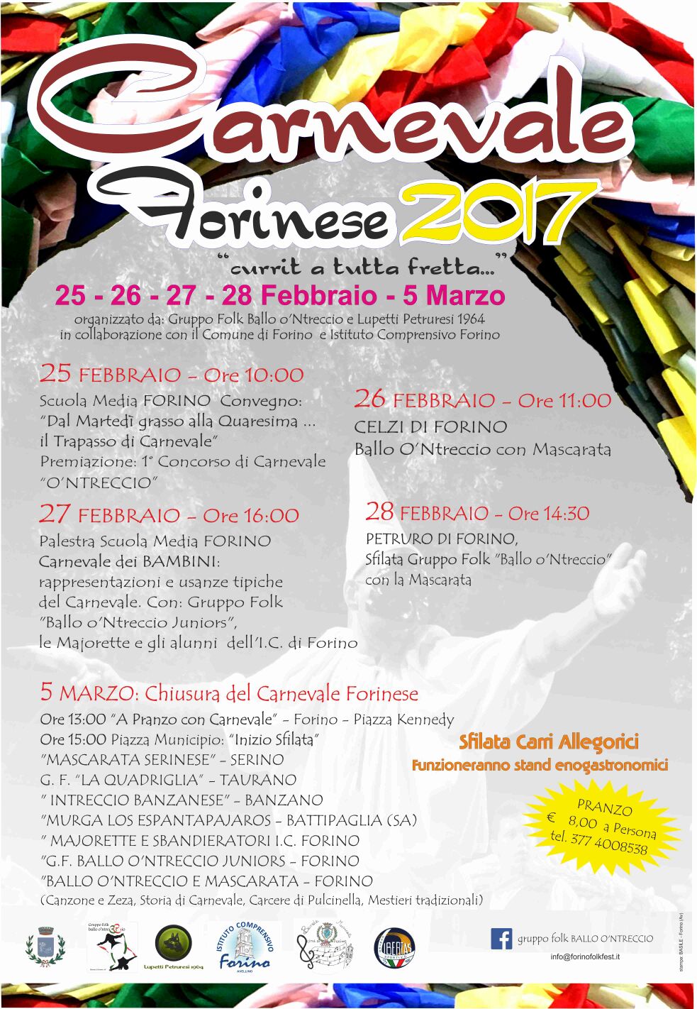 Sabato 25 febbraio si apre l’edizione 2017 del Carnevale Forinese “Currit a tutta fretta” alle ore 10 presso l’Auditorium della Scuola Statale di 1° Grado “Elodia Botto Picella” I.C. con il Convegno di Studio dal titolo “Dal martedì Grasso alla Quaresima, il trapasso di Carnevale”. Al tavolo dei relatori ci saranno: Gerardo Fiorino, Gruppo Folklorico Ballo ‘O ‘Nreccio, Carmine Iannaccone, Dirigente scolastico I.C. di Forino, Pasquale Nunziata, Sindaco di Forino, Filomena Del Gaizo, Sindaco di Contrada, Domenico Fruncillo, Docente di Scienze Politiche dell’Università di Salerno, Valerio Ricciardelli, etnomusicologo e antropologo dell’Università di Napoli, Luigi De Caro, Funzione strumentale al PTOF dell’I.C. di Forino e Grazia Roberto, educatrice e autrice di una ricerca sul Carnevale Forines e di Enza Trerotola, collaboratrice D.S. rapporti con il territorio dell’I.C. di Forino in qualità di moderatore.