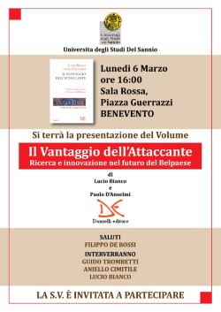 Si terrà lunedì 6 marzo, alle ore 16:00, presso la Sala Rossa dell’Università degli Studi del Sannio di Benevento, in Piazza Guerrazzi, la presentazione del libro “Il vantaggio dell’attaccante. Ricerca e innovazione nel futuro del bel Paese” edito Donzelli.