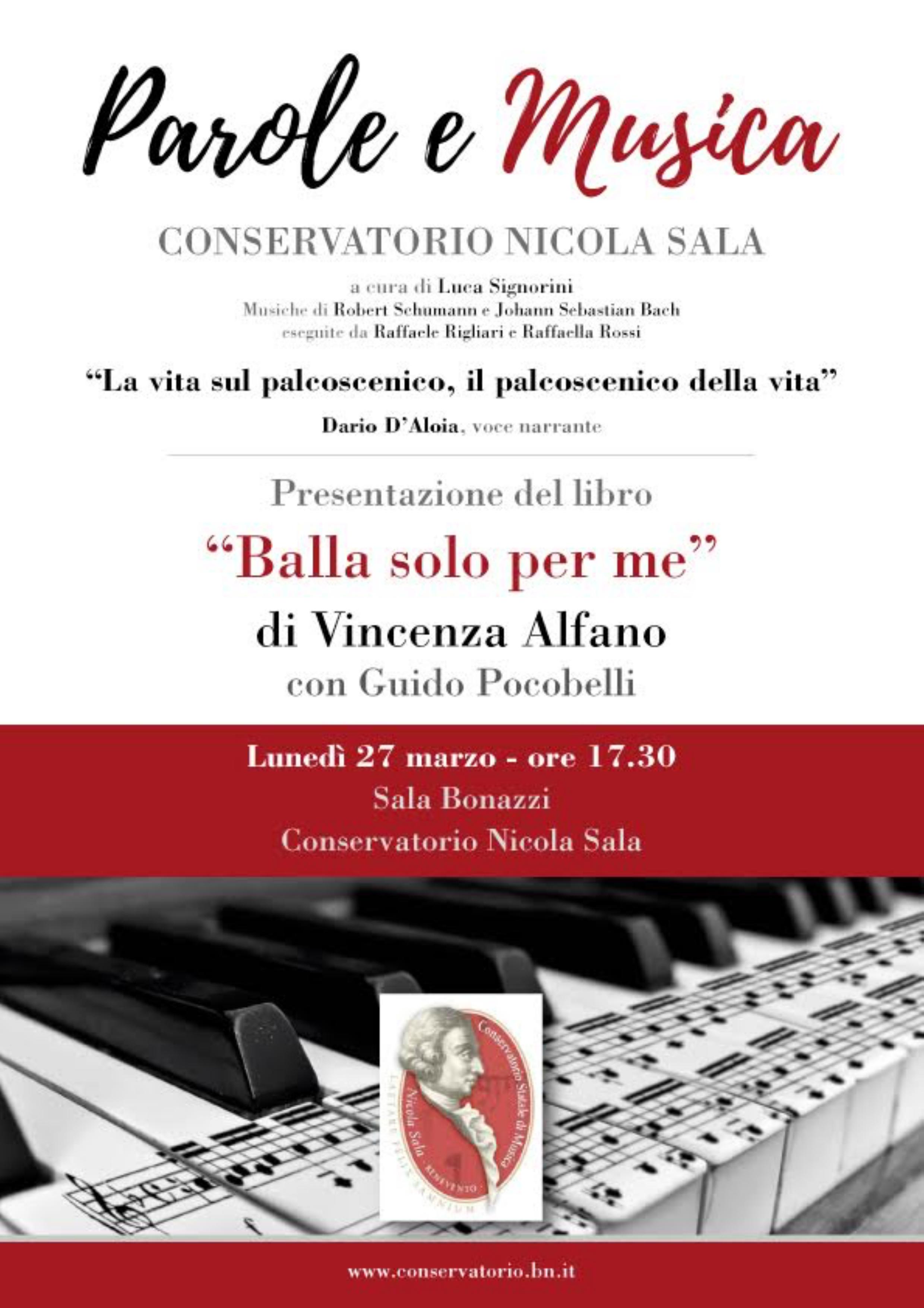 Il Conservatorio di musica «Nicola Sala» di Benevento inaugurerà il Ciclo di incontri artistico-letterari “Parole e Musica”, lunedì 27 marzo 2017, alle ore 17.30, nella splendida cornice della Sala Bonazzi, con la presentazione del libro “Balla solo per me” di Vincenza Alfano, con Guido Pocobelli. La Rassegna “Parole e musica” è curata da Luca Signorini, primo violoncello dell’Orchestra del Teatro S. Carlo e docente presso l’Istituzione di Alta Formazione Musicale sannita.