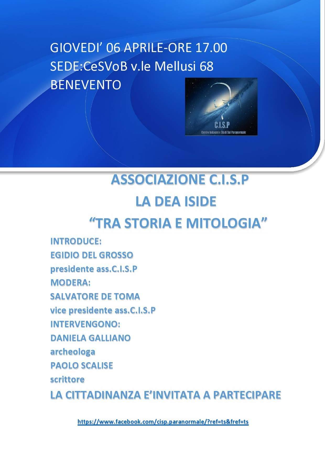 Giovedi prossimo, 6 aprile, a partire dalle ore 17.00, presso la sede provinciale del Cesvob di Benevento, al viale Mellusi, si terrà il convegno “La dea Iside – tra Storia e Mitologia”. L’appuntamento è organizzato dal Centro Indagini e Studi sul Paranormale di Benevento. Introdurrà Egidio Del Grosso, presidente del CISP. Interverranno: Daniela Galliano, archeologa; Paolo Scalise, scrittore.L’incontro sarà moderato da Salvatore De Toma, vice presidente del CISP.