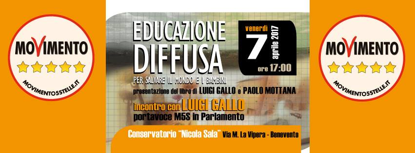 Venerdì 7 aprile alle ore 17,00 nell’Aula Bonazzi del Conservatorio “Nicola Sala”, sarà presentato il libro Educazione diffusa (Dissensi, 2017) di Luigi Gallo, parlamentare del M5S, e Paolo Mottana, dell’Università di Milano-Bicocca. Introdurrà il portavoce del M5S al Consiglio comunale di Benevento, Nicola Sguera.