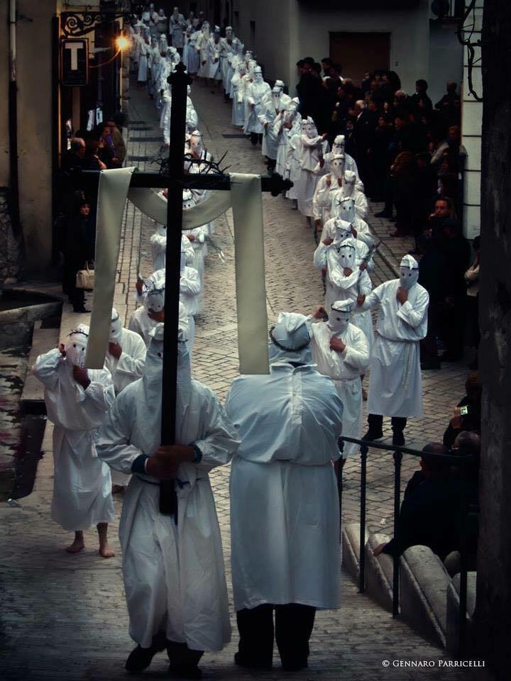 I riti penitenziali del venerdì santo a San Lorenzo maggiore, rappresentano il gran momento della comunità che esprime la propria gratitudine al Cristo e la Vergine Addolorata. Quest’anno l’appuntamento è per Venerdì 14 Aprile con l’inizio della processione previsto per le 19.30 con partenza da Piazza Largo di Corte. Una tradizione di certo singolare, che si perde nella notte dei tempi e che chiama alla partecipazione tutti i Laurentini vicini e lontani nonché turisti, fedeli e curiosi. Le prime testimonianze riguardo la processione risalgono al ‘700, quando l’antica chiesa di San Rocco, nel centro storico del paese, fu dotata di una pregevole statua della Vergine Addolorata, la stessa che ancora oggi viene portata in processione e in onore della quale essa si svolge. Tutti i Laurentini sono legati all’Addolorata da una sincera devozione, aumentata anche dai numerosi miracoli operati per intercessione della Vergine. Fino agli anni sessanta del ‘900, la processione si svolgeva alle 7 del mattino con partenza dalla chiesa di San Rocco: il lunghissimo corteo era aperto da un gruppo di giovani, che cantavano salmi penitenziali e dalle varie confraternite; seguivano i battenti, che si percuotevano (e si percuotono tutt’oggi) con la disciplina, oggetto penitenziale dotato di piastrelle taglienti di ferro; dopo di essi veniva la statua della Madonna Addolorata, portata a spalle da incappucciati appartenenti ad alcune famiglie che tramandano la tradizione da diverse generazioni; in ultimo vi era la grande moltitudine di fedeli, molti dei quali scalzi e recanti ceri votivi. Con il mutamento della liturgia, la processione è stata spostata al tardo pomeriggio ma conserve inalterate le altre caratteristiche. La funzione inizia nella chiesa parrocchiale di San Lorenzo Martire con l’adorazione della Croce; in seguito vi è lo spostamento verso la chiesa del SS nome di Dio, dove sono esposte le statue di Gesù morto e della Vergine Addolorata, rivestita delle sacre vesti e da qui ha inizio la toccante processione. I battenti, uomini e donne Laurentini ma provenienti anche da paesi vicini, indossano un camice bianco che richiama la purificazione, il volto è coperto da un cappuccio forato agli occhi che li rende irriconoscibili e la testa è circondata da una corona di lunghe spine che richiama quella di Cristo, ai fianchi portano un lungo cordone intrecciato che richiama le funi con cui Cristo fu legato e flagellato; scalzi e con lento incedere percorrono le strade del paese che echeggia canti commoventi eseguiti dal numeroso coro di giovani e dal popolo. Il momento più particolare è quello in cui, al termine della processione, il corteo arriva in piazza largo di corte: qui avviene il commovente incontro tra l’Addolorata e i battenti che procedono in ginocchio fino all’interno della chiesa. È una delle processioni più partecipate e ciò fà capire quanto i Laurentini vivano intensamente la settimana santa, da sempre un momento di penitenza e redenzione. Questo ultimo aspetto ce lo conferma anche Don Giovanni, parrocco di San Lorenzo Maggiore, ‘’Il Venerdì Santo, oltre ad essere un giorno di digiuno, astinenza, e penitenza, così come ci chiede la Chiesa, è il giorno Santo dell’intera Settimana Santa, perché a San Lorenzo Maggiore la gente sente molto il partecipare al dolore di Gesù e al dolore della Vergine Addolorata.’’ Tali riti potrebbe risultare poco comprensibili agli occhi esterni, ma anche su tale prospettiva è sempre il parroco laurentino, lui stesso esterno, a chiarire le personali impressioni registrate la prima volta che ha vissuto la particolarità del Venerdì Santo di San Lorenzo Maggiore ‘’la mia prima impressione è stata molto emozionante, soprattutto vedere tanta gente partecipare ad una Processione così particolare. L’importante è unire corpo, anima mente e coscienza a quello si fa e ciò per cui si prega. Il mio invito è consigliare la partecipazione a tutti i riti della Settimana Santa, tutto ciò per cui la Chiesa ci invita a vivere nel corso della Settimana Santa. Devo dire, con molta soddisfazione, che anche i miei parroci predecessori, hanno lavorato molto bene in tal senso in questa comunità parrocchiale. Il messaggio più bello che vi possa essere è quello di sentirci partecipi delle sofferenze di Gesù e compartecipi al dolore della Vergine Addolorata, per ciò che ha visto visiere a suo figlio. Il buon cristiano, sa che partecipando a questa processione e tale rito di penitenza, li vive in tutto e per tutto. Il messaggio della fede deve durare tutto l’anno liturgico. È bello che a questa processione si partecipi con la consapevolezza di ciò che si fa e con tanta fede nel cuore.’’