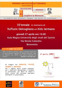 Giovedì 27 aprile, a partire dalle ore 10.00 presso l’Aula Magna dell’Università degli Studi del Sannio in Via Nicola Calandra, sarà celebrato il 35°ennale in memoria di Raffaele Delcogliano e Aldo Iermano.