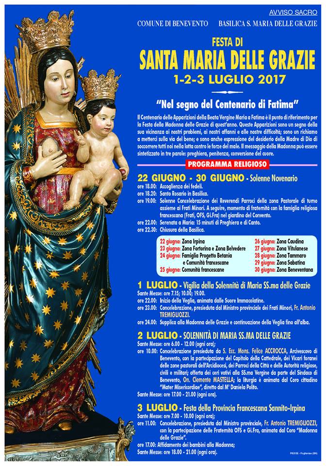 Il clou dei festeggiamenti in onore della Madonna delle Grazie ci sarà nei giorni 1,2 e 3 luglio. La sera del 1° luglio a partire dalle ore 22 comincerà la veglia notturna in onore della Vergine: alle 23 la solenne celebrazione eucaristica presieduta da fra Antonio Tremigliozzi, Ministro provinciale dei frati minori del Sannio e dell’Irpinia, con la supplica alla Madonna. Il giorno 2, festa di Santa Maria delle Grazie, alle ore 10 ci sarà la solenne concelebrazione eucaristica presieduta dall’Arcivescovo di Benevento Mons. Felice Accrocca, nel corso della quale il sindaco della città, Clemente Mastella, accenderà la lampada votiva alla Madonna, Patrona di Benevento. Il 3 luglio, festa della provincia francescana del Sannio e dell’Irpinia, alle ore 11 ci sarà la solenne concelebrazione eucaristica presieduta da fra Antonio Tremigliozzi, Ministro provinciale dei frati minori. Nel pomeriggio, alle ore 17 la consacrazione dei bambini alla Vergine.