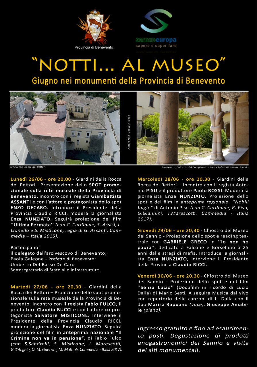 “Notti al Museo … – Giugno nei monumenti della Provincia di Benevento”, evento che nasce su impulso del presidente Ricci, è curato in tutti gli aspetti organizzativi e logistici, dalla Società partecipata Sannio Europa, cui è stato affidato il compito di realizzare gli indirizzi programmatici indicati dal Presidente volti a valorizzare e promuovere i giacimenti culturali del patrimonio monumentale, artistico e storico dell’Ente.