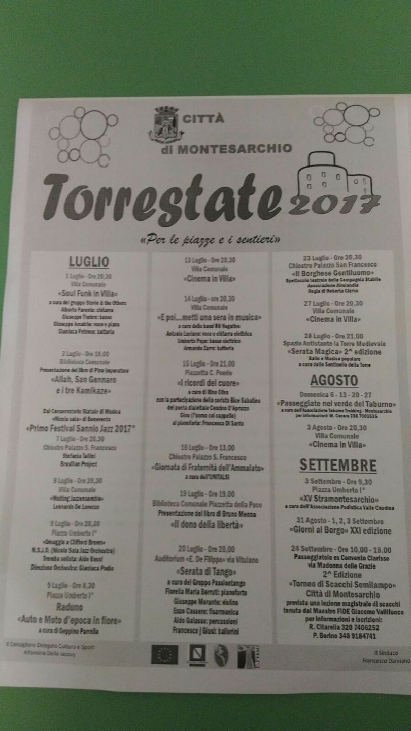 Su Torrestate si è pronunciata anche l’assessore alla cultura Alfonsina Dello Iacovo: “Credo che sia un ottimo programma, di un evento giunto ormai alla quinta edizione, con un cartellone che ho voluto a vocazione culturale sin dal 2013. Un programma dedicato a giovani e meno giovani, e in questa edizione abbiamo occupato tutti gli spazi comunali che volutamente l’amministrazione ha messo a disposizione: dal passeggiatoio al chiostro comunale, e in più si aggiunge la Villa comunale, luogo simbolo di Montesarchio che finalmente torna a disposizione della collettività”.