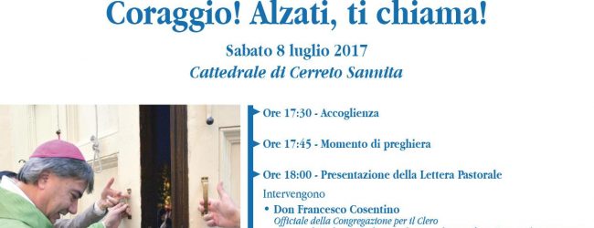 A meno di un anno dal suo insediamento, il vescovo della Diocesi Mimmo presenterà la sua prima Lettera Pastorale sabato 8 luglio alle ore 17:30 presso la Cattedrale di Cerreto Sannita, intitolata come il suo motto episcopale “Coraggio! Alzati, ti chiama!”.