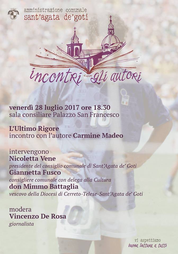 L’estate di un piccolo paesino calabrese, con i suoi bar, le sue storie d’amore ed i suoi problemi e sullo sfondo i mondiali di calcio del 1994. Inizia così “L’Ultimo Rigore”, il romanzo di Carmine Madeo (pubblicato da “La Ruota edizioni”) che sarà protagonista venerdì 28 luglio alle 18.30 presso la sala consiliare di Palazzo San Francesco a Sant’Agata de’ Goti di un nuovo appuntamento con la rassegna “Incontri con gli Autori”. Ma la storia raccontata nel libro di Madeo è anche una storia di ‘ndrangheta, di soprusi e di scelte. Un libro contro le mafie che l’autore ha voluto supportasse le iniziative di Stampo Antimafioso, associazione alla quale è devoluto il ricavato dalle vendite del libro. Alla presentazione del libro sarà presente l’autore Carmine Madeo. Interverranno il presidente del consiglio di Sant’Agata de’ Goti Nicoletta Vene, il consigliere comunale delegato alla Cultura Giannetta Fusco e sua eccellenza don Mimmo Battaglia, vescovo della diocesi di Cerreto Sannita – Telese Terme – Sant’Agata de’ Goti. L’incontro sarà moderato dal giornalista Vincenzo De Rosa. Incontri con gli Autori è un evento ideato e promosso dall’Amministrazione Comunale guidata dal Sindaco Valentino in linea con gli obiettivi di governo nell’ambito delle politiche di promozione della cultura e della conoscenza attraverso una fruizione semplificata ed accessibile a tutti. L’intento, sostiene Giannetta Fusco, è anche quello di promuovere la lettura, partendo dai temi più svariati, come occasione per cercare di trasmettere a chiunque che leggere e scrivere rappresentano un importante momento di osservazione e di riflessione sulle realtà. Il nostro vescovo, per la funzione sociale che ogni giorno svolge nel territorio sannita e per la sua esperienza di vescovo e prete “viandante”, con la sua presenza saprà garantire un importante contributo alla discussione offrendo a tutti un punto di vista profondo e consapevole. Venerdì 4 agosto ci sarà un nuovo appuntamento della rassegna letteraria con la presentazione del libro “Il Dono della Libertà” di Bruno Menna.