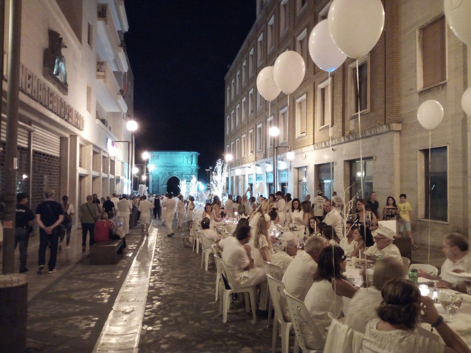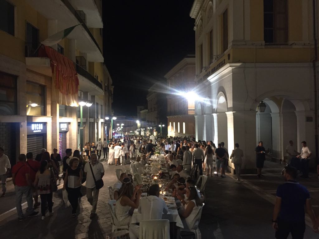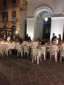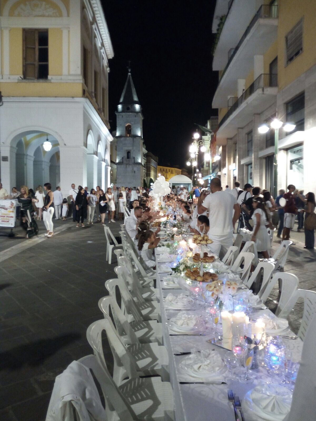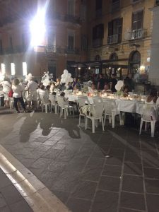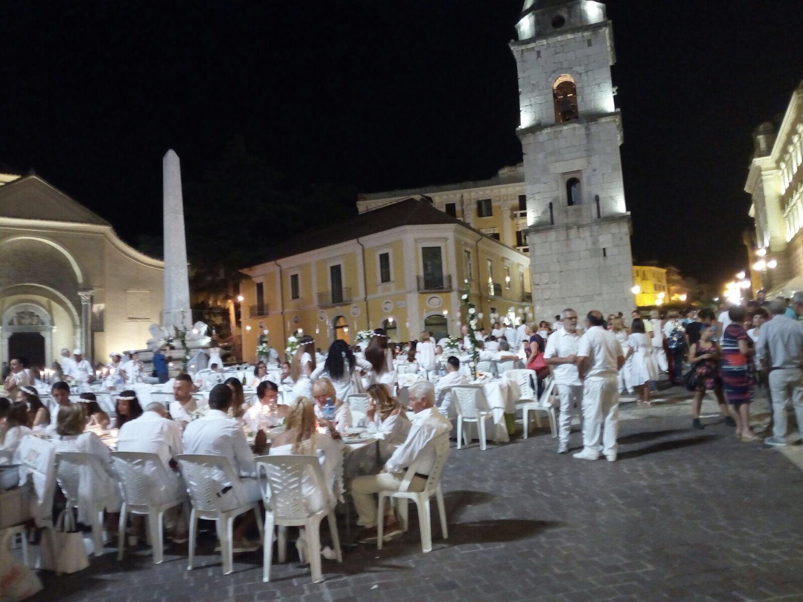 E’ come addentrarsi in una immensa sala delle cerimonie, passeggiare al Corso Garibaldi durante la sera più “in” della Kermesse Benevento Città Spettacolo.E’ la Cena in Bianco, non capita certo tutte le sere di avere al posto delle pareti lo sfondo della Chiesa di Santa Sofia e cenare comodamente seduti come a casa, ma nel cuore della città.