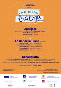 Infine la Cena Baratto a cura di Art’Empori e GASB Arcobaleno, dove tutti sono invitati a portare del cibo cucinato da condividere. Lo spazio del chiostro di San Francesco sarà anche lo sfondo delle opere d’arte di Alfredo Troise, che coloreranno la serata di atmosfere a tinte decise e forti.