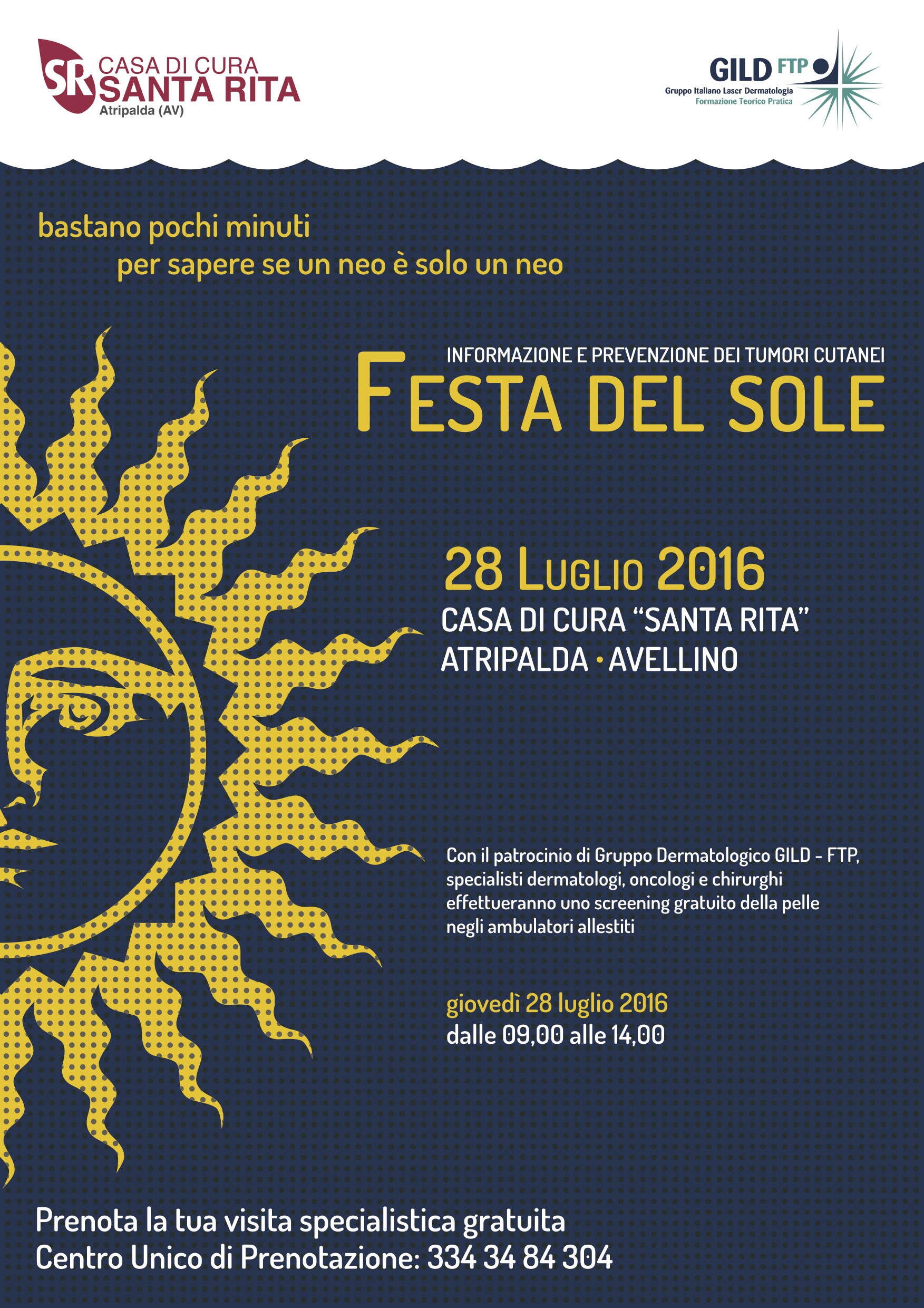 “Bastano pochi minuti per sapere se un neo è solo un neo” con questo slogan alla Casa di Cura Santa Rita di Atripalda il 19 settembre torna la “Festa del Sole” la giornata gratuita di prevenzione del melanoma.