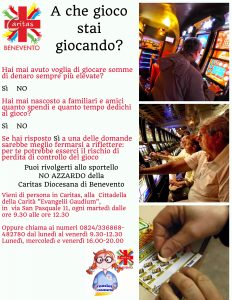 La Caritas diocesana di Benevento, già al fianco degli esercenti che scelgono di non guadagnare con gratta e vinci e slot machine con la campagna #noslot #noazzardo, avvierà lo sportello NO AZZARDO a cui ci si potrà rivolgere recandosi di persona alla sede della Caritas, la Cittadella della Carità “Evangelii Gaudium” ogni martedì dalle ore 9.30 alle ore 12.30 o chiamando ai numeri 0824/336868-482780 dal lunedì al venerdì dalle ore 9.30 alle ore 12.30, il lunedì, il mercoledì e il venerdì dalle ore 16 alle ore 20.