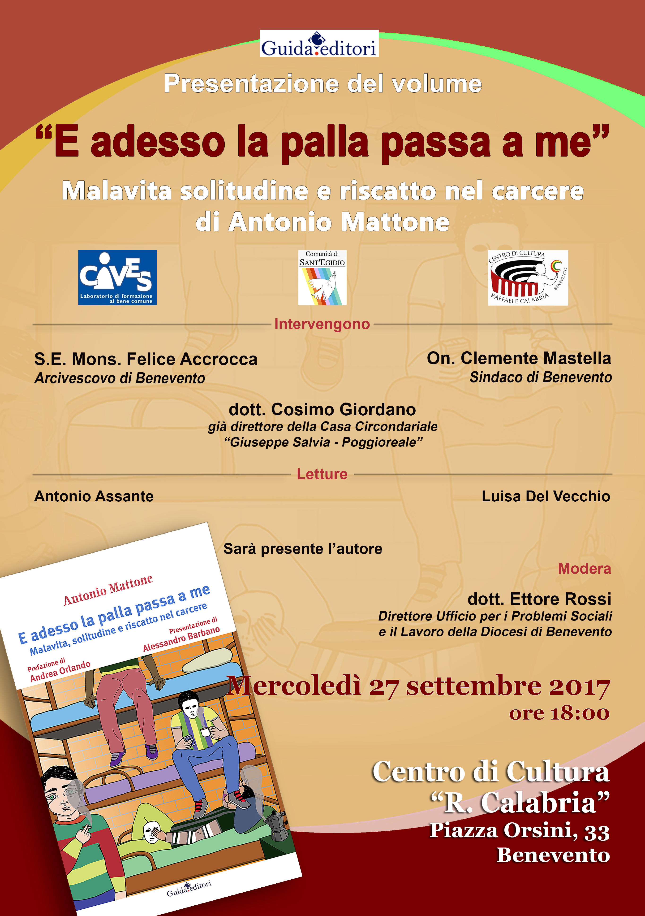 Passione civile e umana solidarietà sono stati i due motori che hanno spinto Antonio Mattone a riflettere su malavita, solitudine e riscatto nel carcere. Ne è nato un volume che sicuramente farà discutere, “E adesso la palla passa a me” (Guida Editori) di cui si parlerà mercoledì 27 settembre a Benevento alle ore 18.00 presso il Centro di Cultura “Raffaele Calabrìa” in Piazza Orsini, 33. Con l’autore, intervengono l’Arcivescovo di Benevento S.E. Mons. Felice Accrocca, il sindaco di Benevento Clemente Mastella e Cosimo Giordano già direttore del carcere di Poggioreale. Modera Ettore Rossi direttore Ufficio per i problemi Sociali e il Lavoro della diocesi di Benevento. Letture di Luisa Del Vecchio e Antonio Assante.
