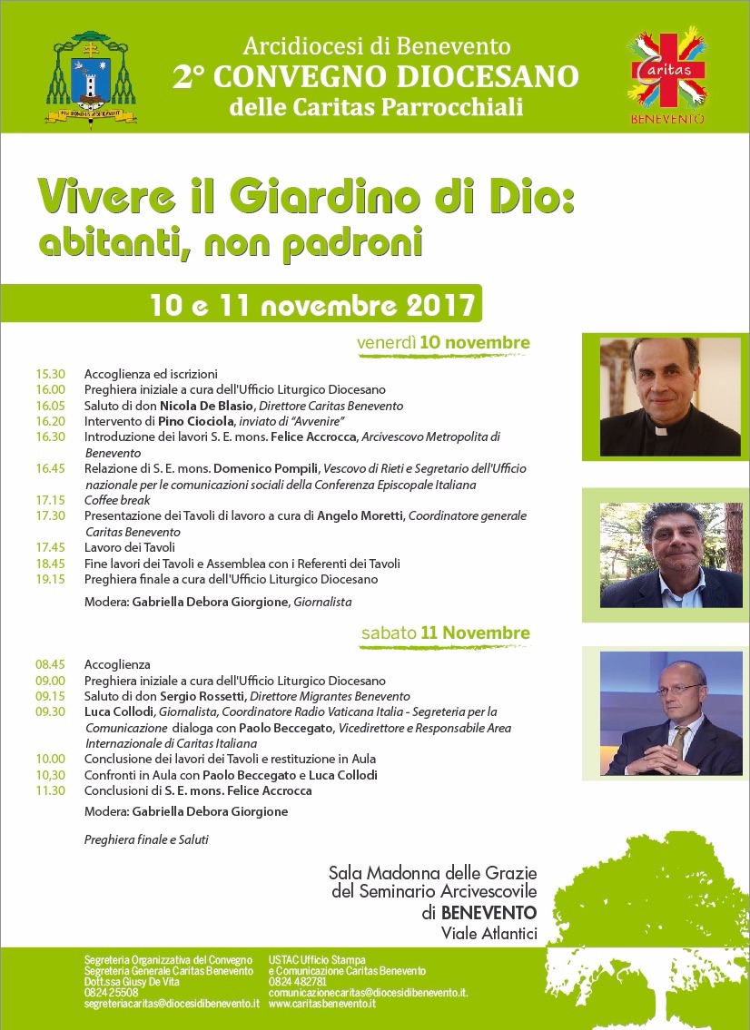 Alla prima giornata, che si aprirà alle 15.30, prenderanno parte, moderati dalla giornalista Gabriella Debora Giorgione, l’Arcivescovo Metropolita di Benevento, mons. Felice Accrocca, S.E. mons. Domenico Pompili, Vescovo di Rieti e Segretario dell’Ufficio nazionale per le comunicazioni sociali della Conferenza Episcopale Italiana, il direttore della Caritas diocesana don Nicola De Blasio e l’inviato di “Avvenire” Pino Ciociola. Il coordinatore generale di Caritas Benevento Angelo Moretti presenterà i Tavoli di lavoro le cui conclusioni saranno restituite nella giornata dell’11 novembre.