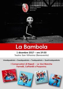 Il Conservatorio di Musica ” Nicola Sala ” di Benevento, presenta, venerdì 1 dicembre alle ore 19.00 presso il Teatro San Vittorino, la Mostra-Concerto ” La Bambola ” – I Conservatori di Napoli – il bel Canto – Farinelli – Caffarelli e Porporino.