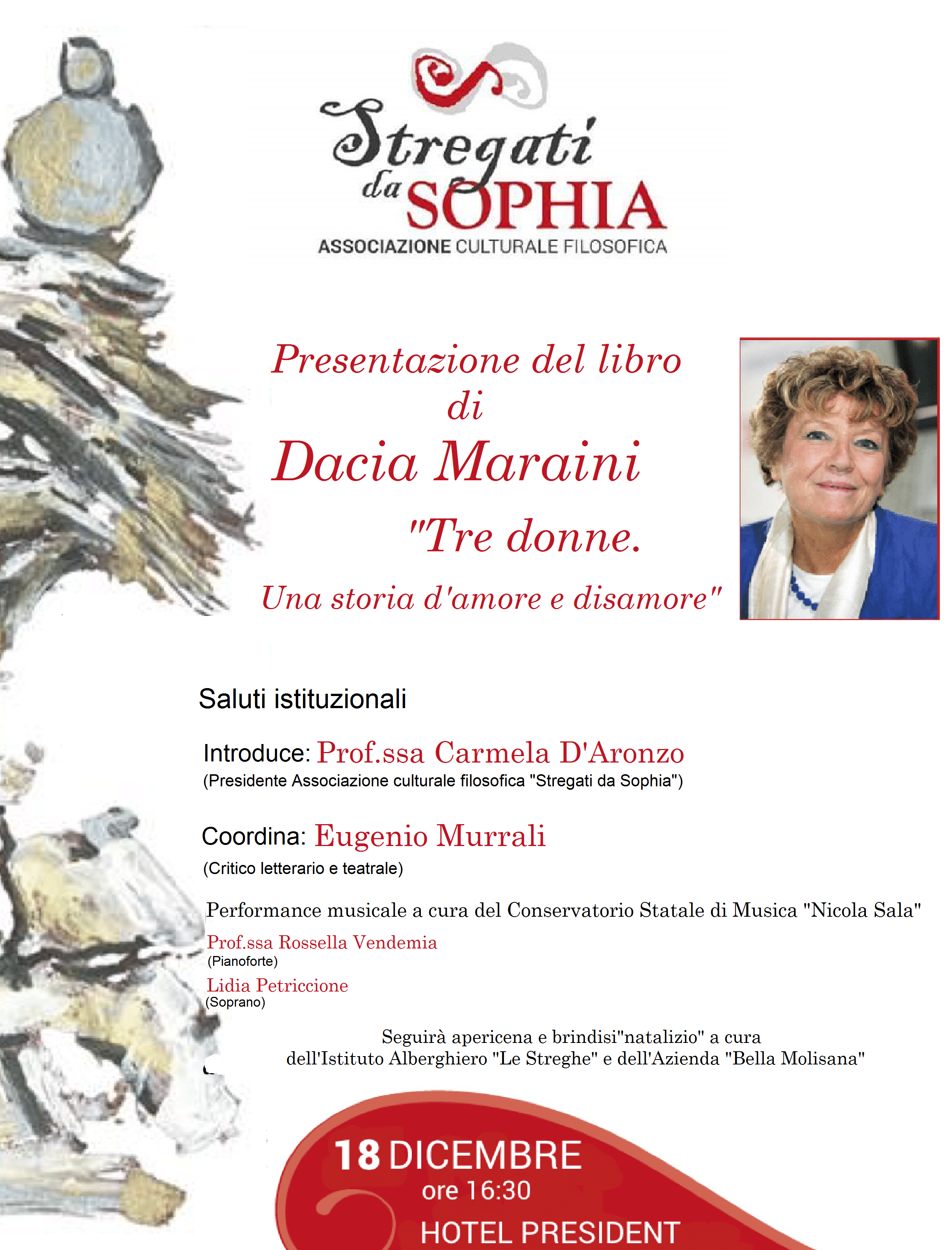 L’Associazione culturale filosofica “ Stregati da Sophia”,ospiterà il 18 dicembre 2017, alle ore 16,30 presso il President Hotel, la scrittrice Dacia Maraini che presenterà il suo ultimo libro “Tre donne. Una storia d’amore e disamore”.