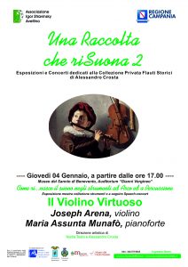 “Una Raccolta che risuona. Esposizione e Concerti dedicati alla Collezione privata Flauti Storici di Alessandro Crosta”: questo il titolo di una iniziativa promossa dall’Associazione Igor Stravinsky di Avellino presso l’Auditorium “Gianni Vergineo” del Museo del Sannio di Benevento il prossimo 4 gennaio 2018 a partire dalle ore 17.00. Con il patrocinio del Ministero dei Beni Culturali, della Regione Campania, della Provincia di Benevento, del Comune di Taurasi e del Museo del Flauto traverso, l’evento si avvale della Direzione artistica di Nadia Testa e Alessandro Crosta. Nell’ambito dell’esposizione è previsto anche uno Speech-concert dal titolo “Il Violino virtuoso” con l’esibizione di Joseph Arena al violino e Maria Assunta Munafò al pianoforte.