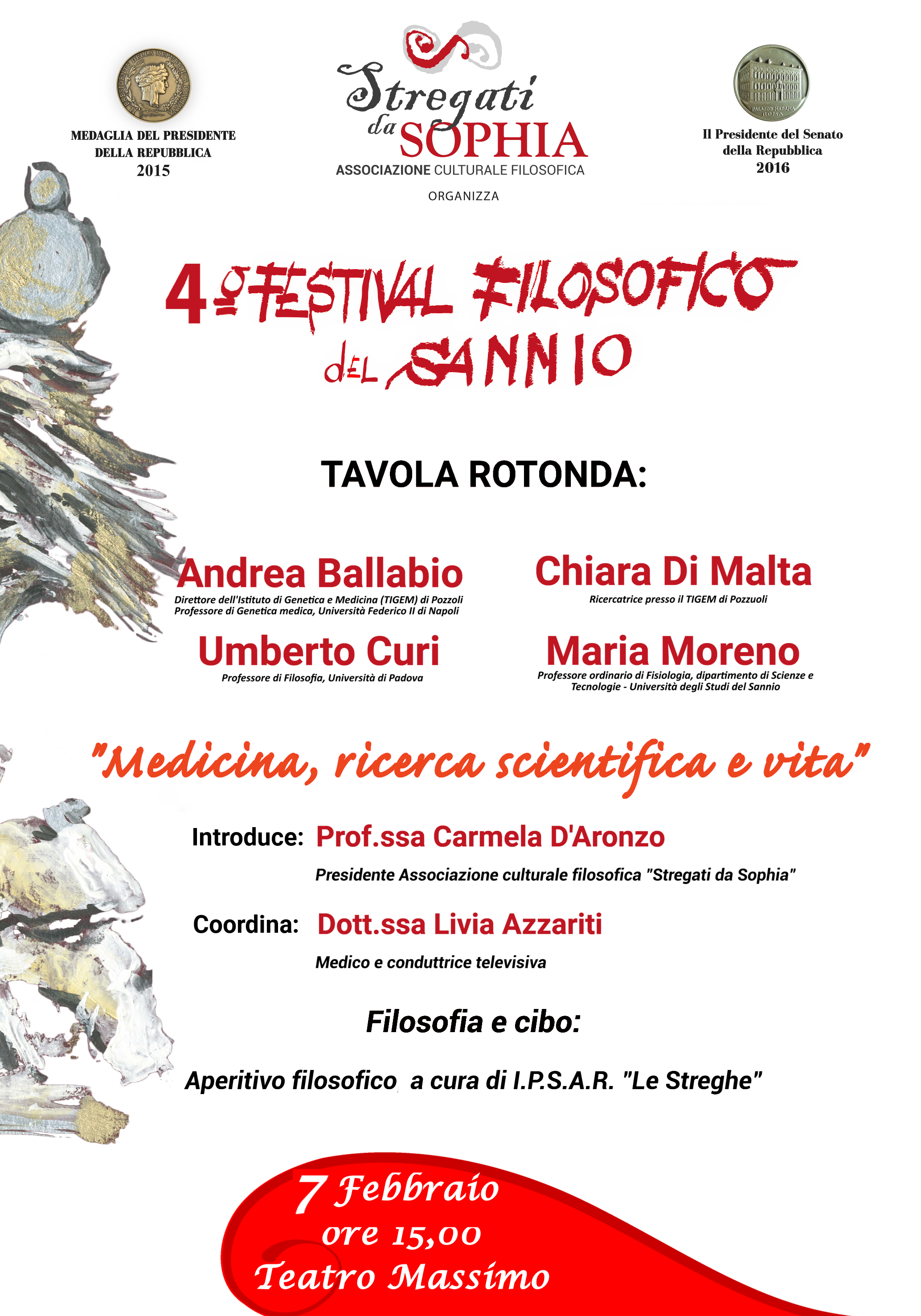 Il giorno 7 Febbraio 2018, alle ore 15,00 presso il Teatro Massimo si terrà il secondo appuntamento del 4° Festival Filosofico del Sannio, organizzato dall’Associazione culturale filosofica “ Stregati da Sophia”.