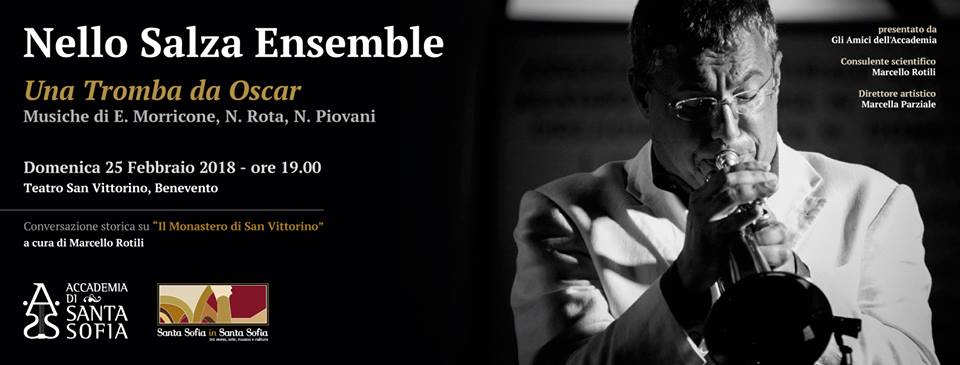 Nuovo appuntamento della seconda edizione della rassegna “Santa Sofia in Santa Sofia”, promossa dall’Accademia di Santa Sofia di Benevento, con la direzione artistica di Marcella Parziale. Domenica 25 febbraio, alle ore 19.00, presso il Teatro San Vittorino di Benevento, spazio al concerto “Una Tromba da Oscar”. Ad esibirsi sarà la Nello Salza Ensemble. Saranno eseguite alcune delle più belle e suggestive colonne sonore del cinema internazionale, di cui Nello Salza è stato interprete originale, collaborando con compositori quali Ennio Morricone, Nicola Piovani e molti altri.