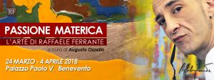 La splendida location di Palazzo Paolo V ospiterà dal 24 marzo la personale dell’artista Raffaele Ferrante dal titolo “Passione materica”. L’artista è anche noto come comico dell’esilarante trio partenopeo “I Ditelo Voi” del programma televisivo RAI “Made in Sud”. La mostra è curata da Augusto Ozzella, organizzata dall’Associazione culturale Cosmoart e coordinata da Nadia Oliva.