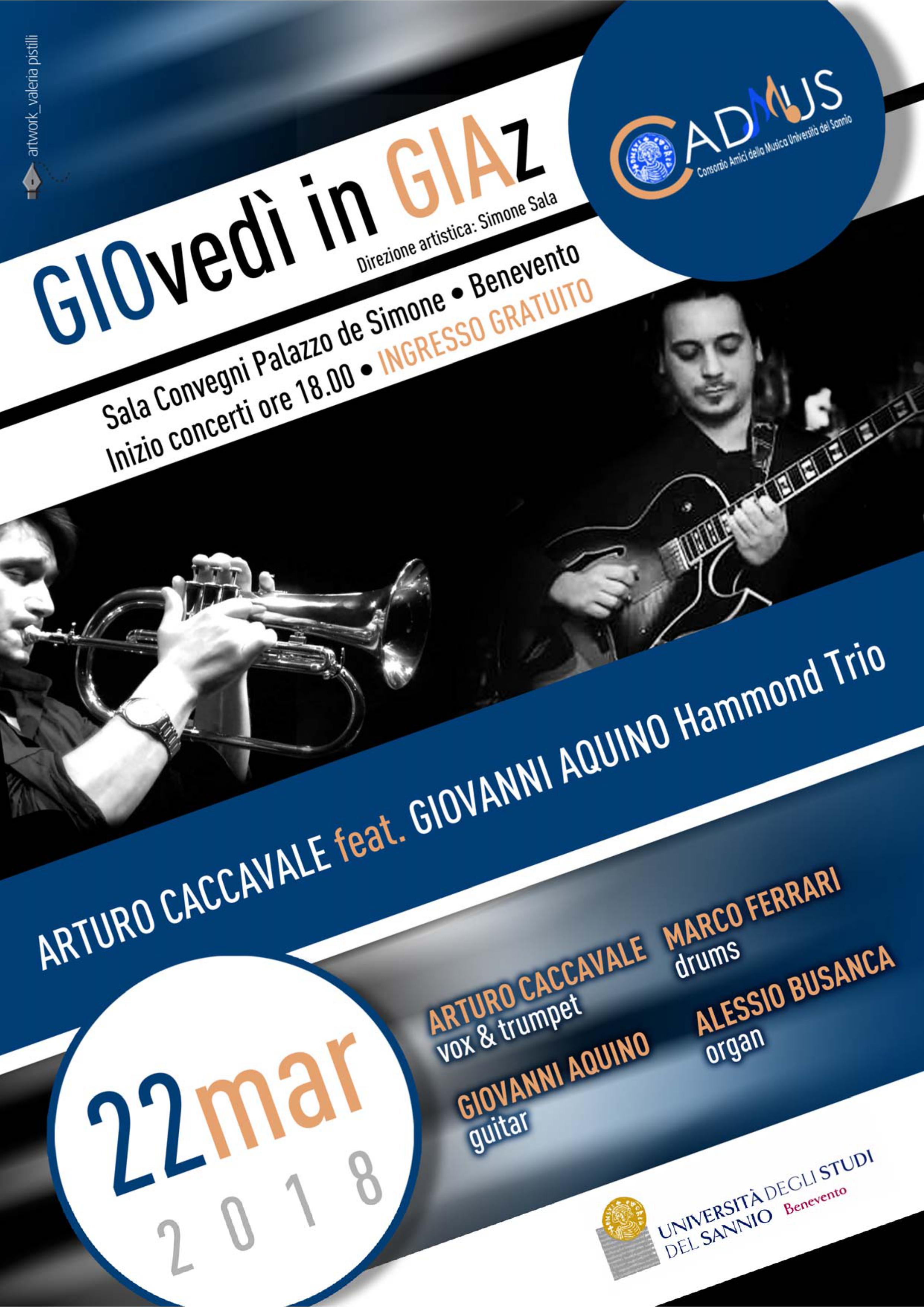 Domani giovedì 22 marzo, alle ore 18, presso la Sala Convegni di Palazzo De Simone a Benevento, si terrà il concerto inaugurale della stagione 2018 di CADMUS (Consorzio Amici della Musica dell’Università del Sannio). Il concerto del cartellone GIOvedì in GIAz, curato dal direttore artistico Simone Sala, prevede la partecipazione del Giovanni Aquino Hammond Trio e del trombettista Arturo Caccavale.