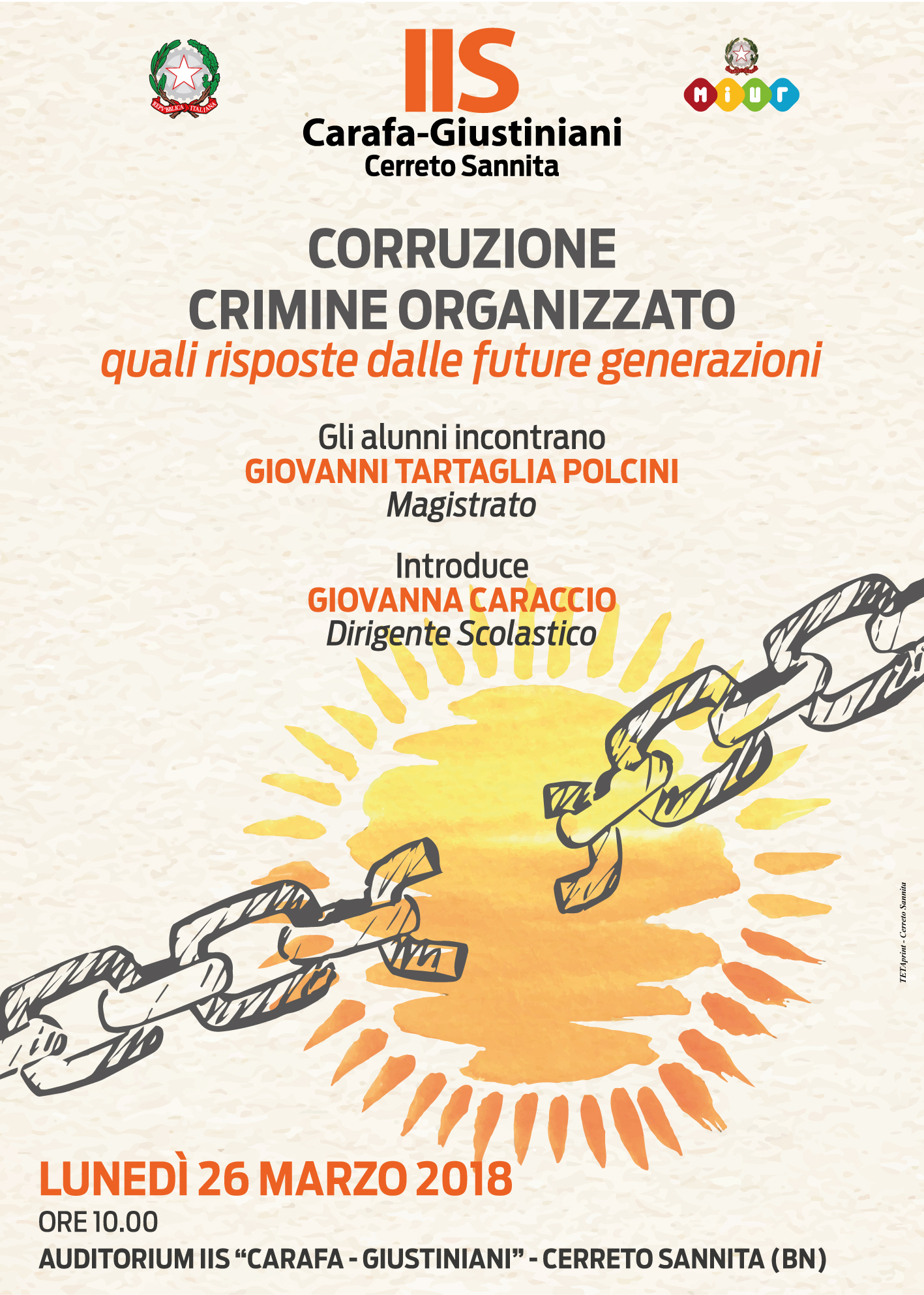 “Corruzione crimine organizzato quali risposte dalle future generazioni”. Relatore sarà il Magistrato Giovanni Tartaglia Polcini.L’evento è finalizzato a diffondere tra i giovani la cultura della legalità e si colloca nell’ambito delle giornate dedicate alla Memoria e all’Impegno in ricordo delle Vittime Innocenti delle mafie.