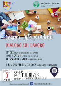 Il Progetto Policoro della Diocesi di Benevento e l’Ufficio diocesano per i Problemi Sociali e il Lavoro promuovono giovedì 5 aprile alle ore 20.30 presso il Pub The river in Contrada S. Colomba di Benevento l’iniziativa: “Giovani intraprendenti. Dialogo sul lavoro”.