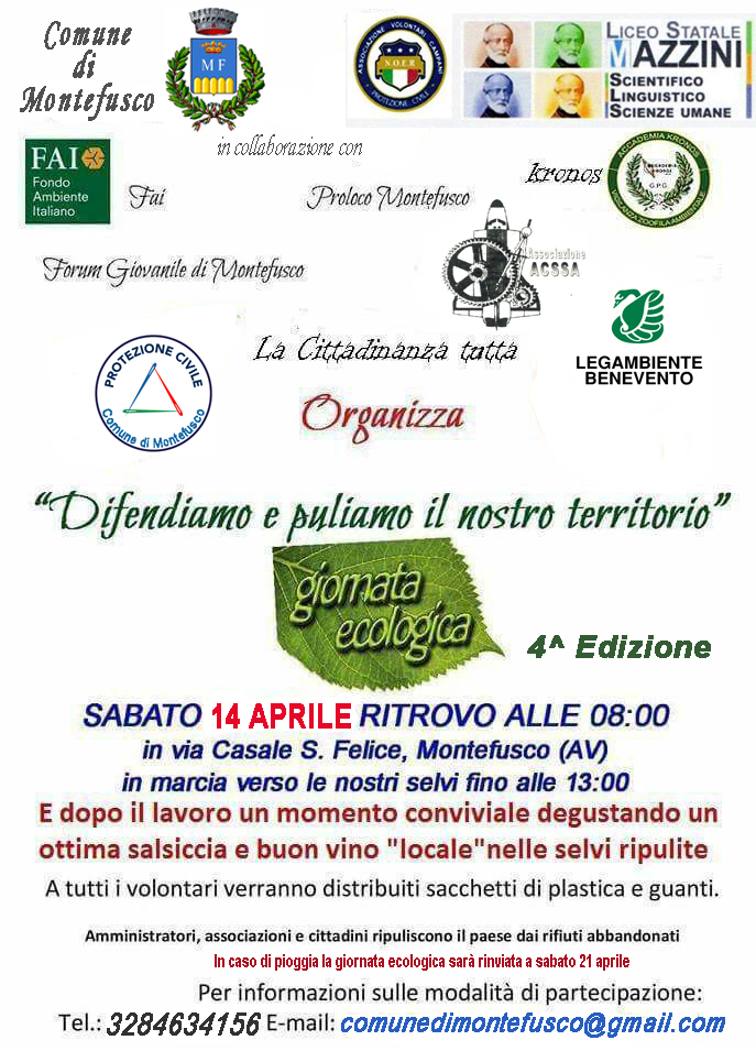 Montefusco (AV) – Domani, si svolgerà l’ormai tradizionale giornata “Difendiamo e puliamo il nostro territorio” l’iniziativa arrivata ormai alla sua 4^ edizione promossa dal Comune di Montefusco in collaborazione con il Fai di Avellino, il kronos di Avellino, la Pro loco di Montefusco, il Forum dei giovani, i cittadini e le associazioni ACSSA e AVE NOER di Napoli, quest’anno sul posto presenti anche Legambiente di Benevento, la protezione Civile di Montefusco e il Liceo Giuseppe Mazzini di Napoli. La giornata ha come obiettivo quello di ripulire i luoghi verdi dall’abbandono dei rifiuti, usanza poco civile purtroppo ancora diffusa, ma anche di sensibilizzare tutti i cittadini ad essere in prima fila per la difesa dell’ambiente, coinvolgendo in modo attivo e concreto le associazioni di volontariato già impegnate nella tutela ambientale.