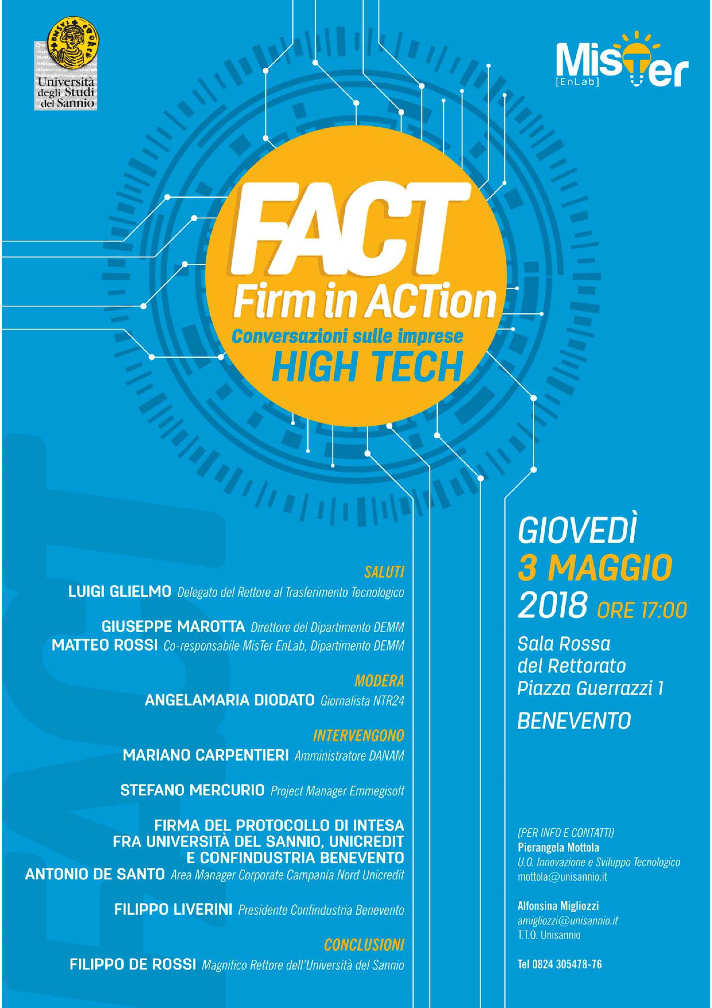 Queste conversazioni vogliono accendere i riflettori su imprese e nuova imprenditorialità del territorio sannita. Il primo workshop si occuperà di imprese high tech. Inoltre, nel primo FACT, che vedrà la partecipazione della Emmegisoft e della DANAM, ci sarà anche la stipula di un protocollo di intesa fra l’Università del Sannio, Confindustria Benevento e Unicredit, finalizzato al potenziamento delle collaborazioni fra gli attori che possono contribuire allo sviluppo imprenditoriale del territorio.