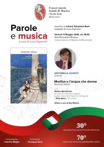 Si terrà venerdì 11 maggio alle ore 18,30 presso la sala Bonazzi del Conservatorio Nicola Sala di Benevento, nell’ambito della rassegna “Parole & musica”, ideata e curata da Luca Signorini, la presentazione del libro “Morfisa o l’acqua che dorme” di Antonella Cilento. Ne parlerà con l’autrice Stefano Manferlotti, docente di Letteratura inglese presso l’Università Federico II di Napoli. Modera la giornalista Elide Apice. Le musiche sono a cura di Luca Signorini, musicista, compositore e scrittore.