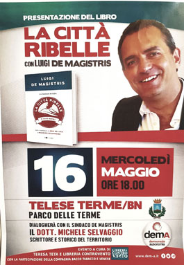 Luigi De Magistris, sindaco di Napoli, mercoledì prossimo, 16 maggio, sarà a Telese Terme presso la Sala Goccioloni delle terme, per presentare il suo libro “La città ribelle – il caso Napoli”, scritto insieme alla giornalista Sarah Ricca e con la collaborazione di Erri De Luca e Maurizio De Giovanni.