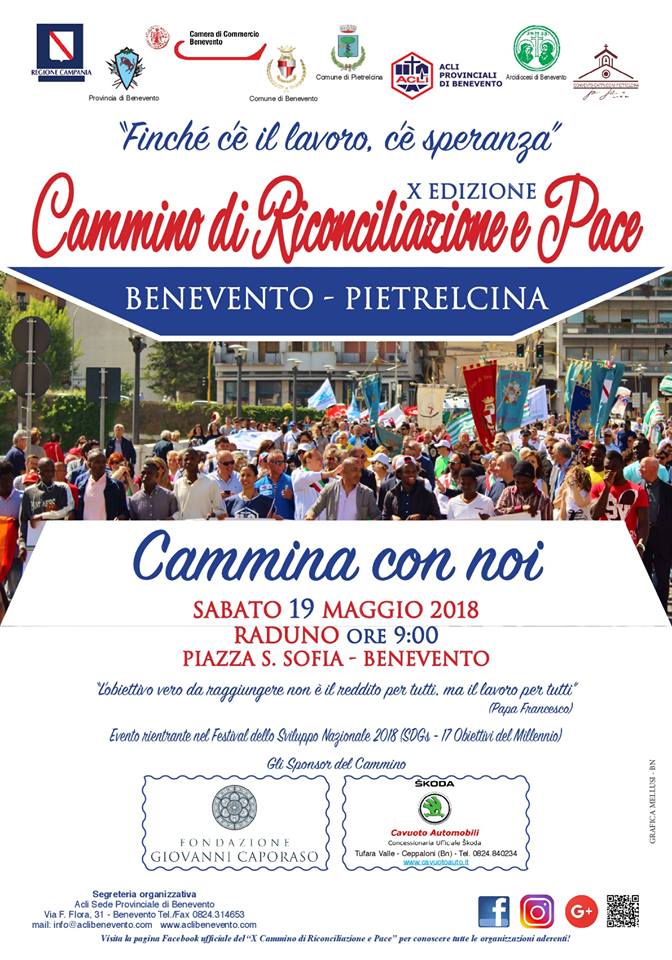 Sabato 19 maggio c.a. si terrà il X Cammino di Riconciliazione e Pace, “ Finché c’è il lavoro, c’è speranza”, organizzato dalle Acli Provinciali di Benevento, dal Comune di Benevento, dal Comune di Pietrelcina, dalla Diocesi di Benevento, dal Convento dei Cappuccini di Pietrelcina, con il patrocinio della Regione Campania, della Provincia di Benevento e della Camera di Commercio di Benevento. Il raduno è previsto per le ore 9.00 in piazza Santa Sofia di Benevento.