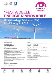 Il 24 e il 25 maggio p.v. si celebra, a Ginestra degli Schiavoni, la Festa delle Energie Rinnovabili il cui programma, quest’anno, rientra a far parte di ‘Welcome To Sannio’ (Regione Campania POC 2014-2020), progetto che sin da dicembre scorso si è posto come obiettivo la promozione di una rete di eventi in grado di collegare alcune delle principali località del Fortore beneventano, così da favorire la conoscenza storico-artistica dei borghi e promuovere il turismo.