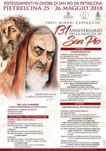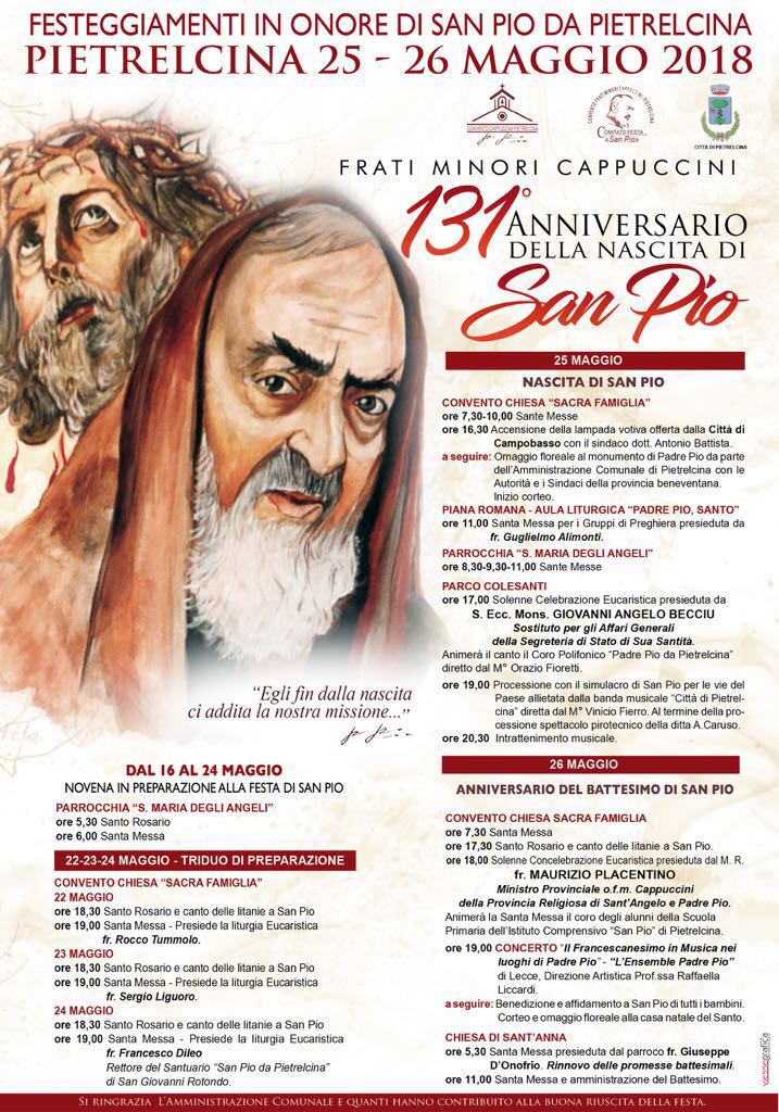 Sara’ l’Arcivescovo di Benevento, monsignor Felice Accrocca, a presiedere domani la solenne celebrazione Eucaristica in occasione del 131 anniversario della nascita di San Pio”. Lo rende noto il Sindaco di Pietrelcina, Domenico Masone. Il programma per la giornata di domani prevede, in particolare, l’accensione (ore 16,30) della lampada votiva nella Chiesa della Sacra Famiglia offerta dalla Citta’ di Campobasso con il sindaco Antonio Battista. A seguire ci sara’ l’omaggio floreale al monumento di Padre Pio da parte dell’Amministrazione comunale di Pietrelcina insieme alle Autorita’ e agli altri sindaci della provincia di BENEVENTO. La solenne celebrazione con l’Arcivescovo Accrocca, che si terra’ al Parco Colesanti (ore 17), sara’ animata dal canto del Coro Polifonico “Padre Pio da Pietrelcina”, diretto dal Maestro Orazio Fioretti. “Sara’ il primo anniversario della nascita di San Pio – dice il sindaco Masone – che festeggeremo all’indomani della prima e unica visita di un Papa a Pietrelcina per la quale tanto si e’ adoperato proprio il nostro Arcivescovo Accrocca”
