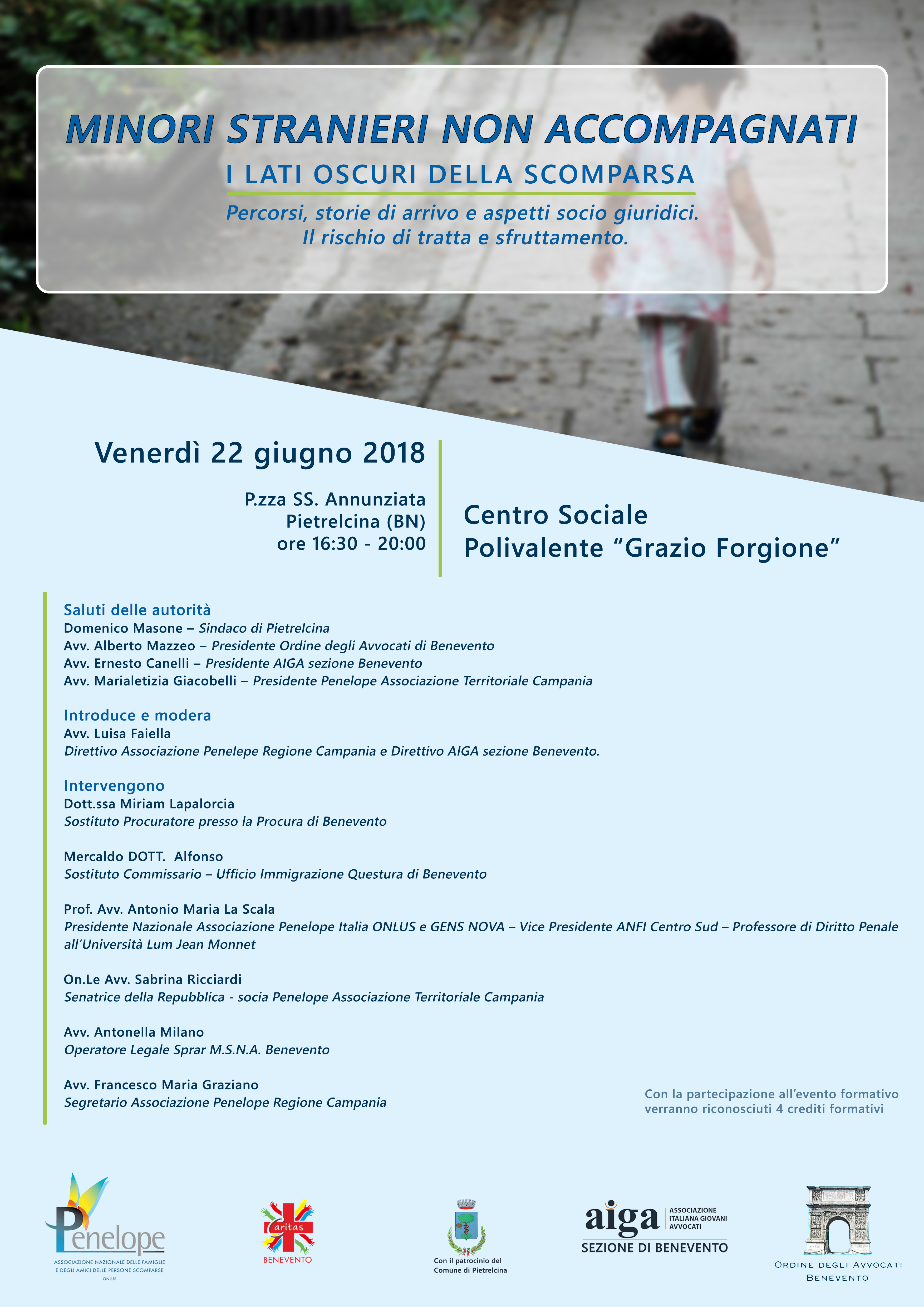 “Minori stranieri non accompagnati. I lati oscuri della scomparsa” è il titolo del convegno organizzato da “Penelope. Associazione Nazionale delle Famiglie e degli Amici delle Persone Scomparse” e dall’AIGA (Associazione Italiana Giovani Avvocati), con il patrocinio della Caritas di Benevento, del Comune di Pietrelcina e dell’Ordine degli Avvocati di Benevento.