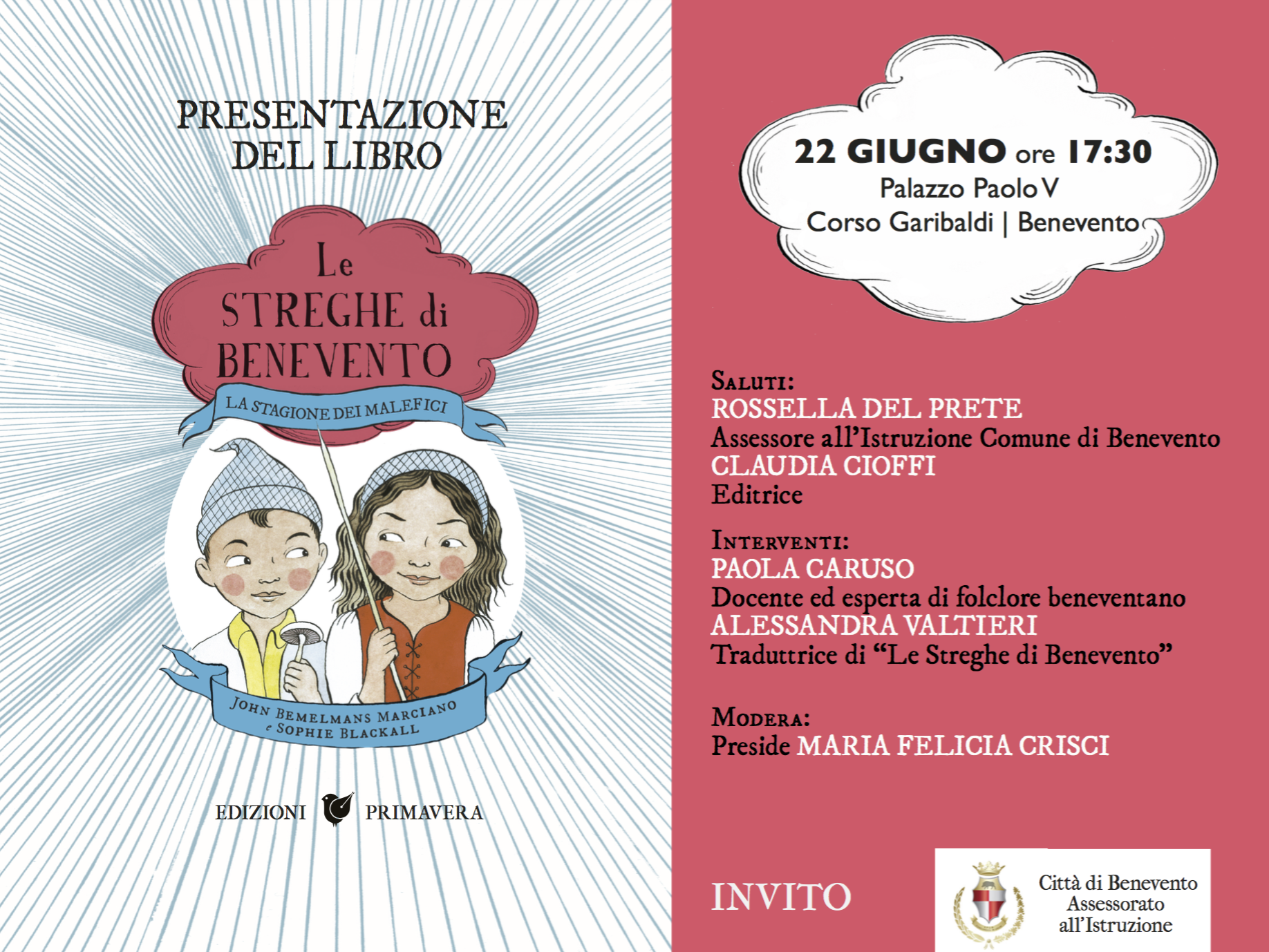 Venerdì 22 giugno alle ore 17.30, presso il Salone delle Conferenze di palazzo Paolo V a Benevento, si terrà la presentazione del libro “Le Streghe di Benevento” Edizioni Primavera. La casa editrice americana, Penguin Random House,due anni fa decise d’investire sul folclore beneventano, con la storia di 5 bambini a caccia di streghe, tra le strade di una Benevento del 1820. L’edizione italiana, arrivata nelle librerie il 19 giugno, è il risultato di un ambizioso progetto, realizzato da una giovanissima casa editrice campana, Edizioni Primavera, che, acquistati i diritti d’autore, porta in Italia la saga dedicata alle Janare beneventane. La presentazione della prima edizione italiana, è organizzata dall’Assessore all’Istruzione Rossella Del Prete, nell’ambito delle attività dedicate alla lettura e all’educazione al patrimonio. Ospiti della presentazione saranno il direttore editoriale di Edizioni Primavera Claudia Cioffi, la traduttrice Alessandra Valtieri e la docente ed esperta di folclore beneventano Paola Caruso. A coordinare gli interventi sarà la Preside Maria Felicia Crisci.