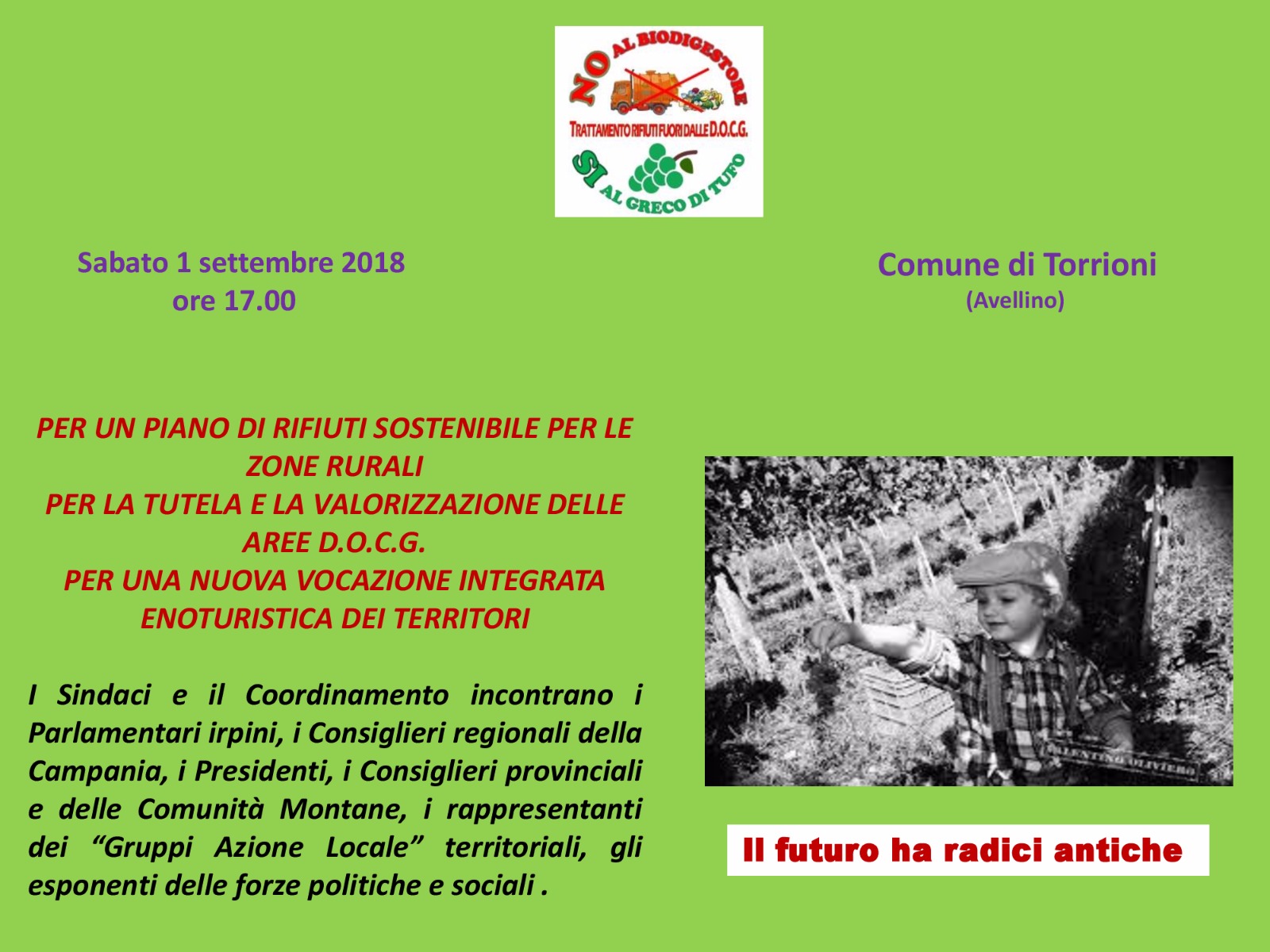 Tutto pronto al Comune di Torrioni per il convegno di domani sabato 1 settembre a firma del coordinamento per il “No al Biodigestore nell’area Docg del Greco di Tufo”. A partecipare i parlamentari irpini e campani, i consiglieri regionali, il presidente e i consiglieri della Provincia di Avellino e delle Comunità Montane. Sul tavolo di discussione la decisione della Regione Campania di autorizzare il Comune di Chianche alla costruzione di un imponente impianto di biodigestore nel cuore dell’area D.o.c.g del “Greco di Tufo” .