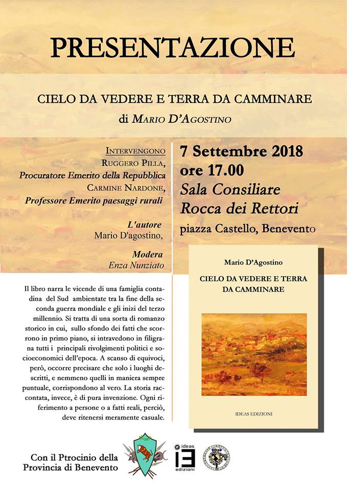 Si terrà venerdì 7 settembre alle ore 17.00 presso la Sala Consiliare della Rocca dei Rettori la presentazione del romanzo Cielo da vedere e terra da camminare di Mario D’Agostino per i tipi di IDEAS Edizioni e con il patrocinio della Provincia di Benevento.