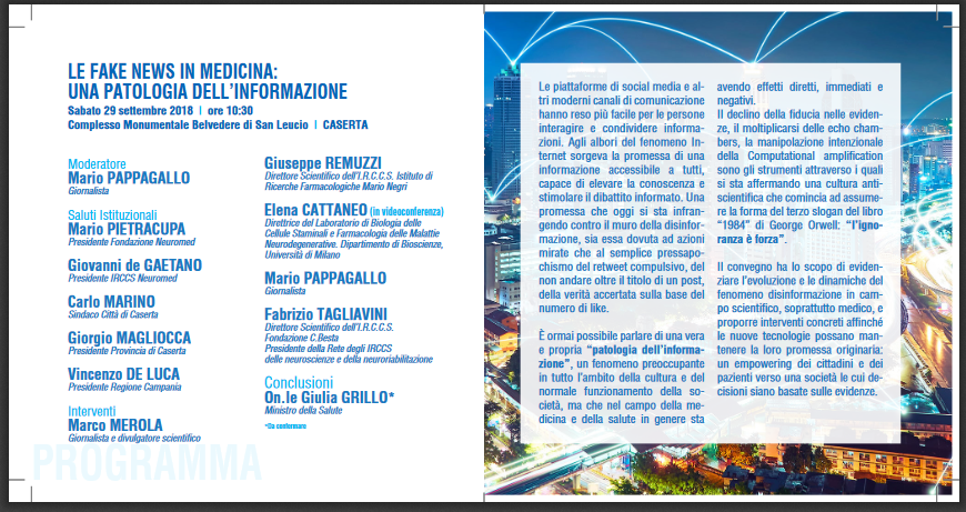 Sabato 29 settembre alle ore 10.30 presso il complesso monumentale  del Belvedere di San Leucio a Caserta, è in programma il convegno dal titolo : “Le fake news: una patologia dell’informazione”. Interverranno e si confronteranno sulla tematica attualissima, tanti esperti del settore medico e della comunicazione. Attesa l’On. Giulia Grillo, Ministro della salute.