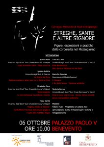 Si terrà sabato 6 ottobre alle ore 10 a Benevento nella cornice di Palazzo Paolo V il convegno “Streghe, Sante e altre signore. Figure, espressioni e pratiche della corporeità nel Mezzogiorno”.