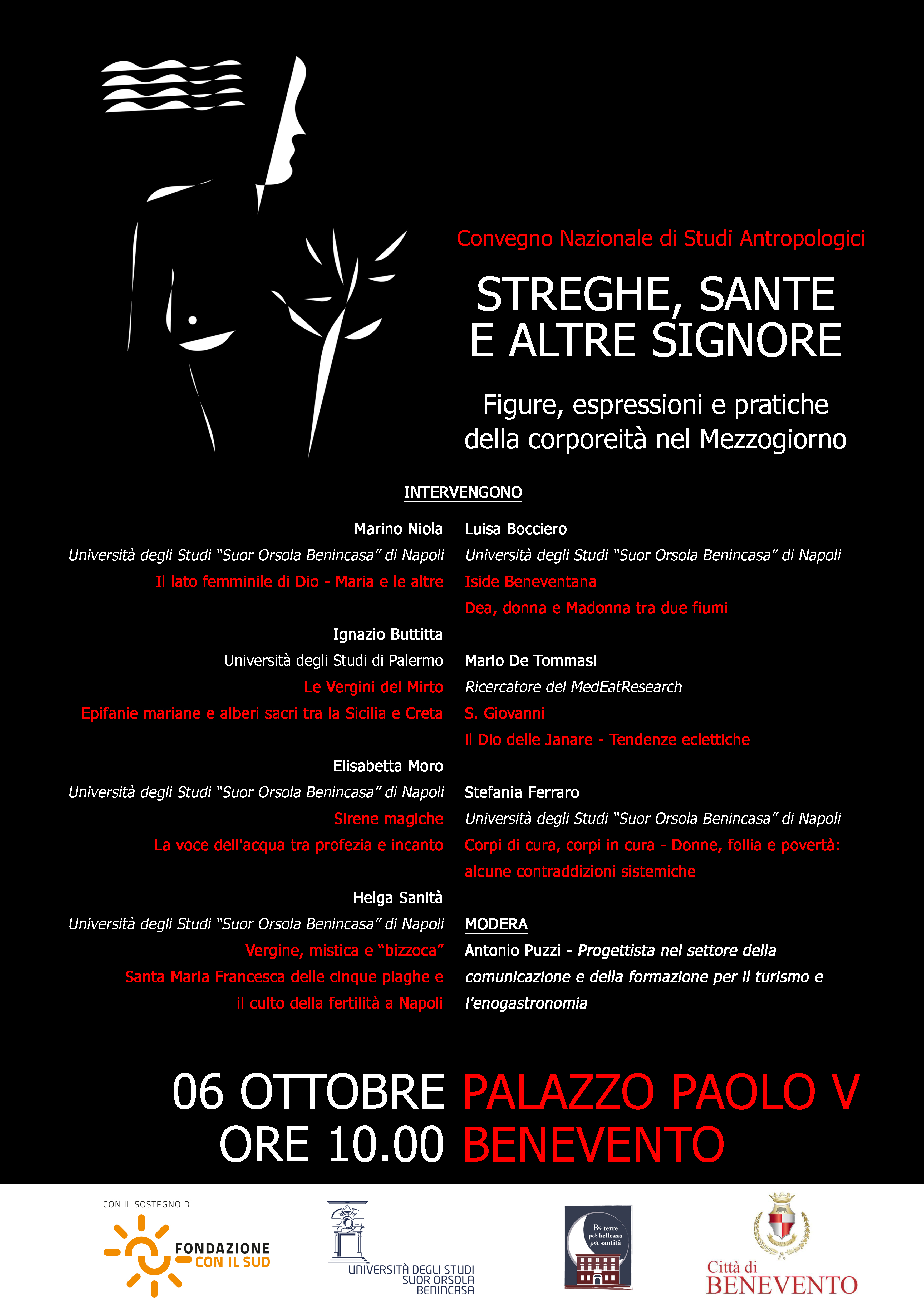 Marino Niola (Università degli Studi “Suor Orsola Benincasa” di Napoli) interverrà su “Il lato femminile di Dio – Maria e le altre”. Ignazio Buttitta (Università degli Studi di Palermo) su “Le Vergini del Mirto – Epifanie mariane e alberi sacri tra la Sicilia e Creta”. Elisabetta Moro (Università degli Studi “Suor Orsola Benincasa” di Napoli) su “Sirene magiche – La voce dell’acqua tra profezia e incanto”. Helga Sanità (Università degli Studi “Suor Orsola Benincasa” di Napoli) su “Vergine, mistica e “bizzoca” – Santa Maria Francesca delle cinque piaghe e il culto della fertilità a Napoli”. Luisa Bocciero (Università degli Studi “Suor Orsola Benincasa” di Napoli) su “Iside Beneventana – dea, donna e Madonna tra due fiumi”. Mario De Tommasi (Ricercatore del MedEatReserch) su “S. Giovanni: il Dio delle Janare – Tendenze eclettiche”. Stefania Ferraro (Università degli Studi “Suor Orsola Benincasa” di Napoli) su “Corpi di cura, corpi in cura – Donne, follia e povertà: alcune contraddizioni sistemiche”.
