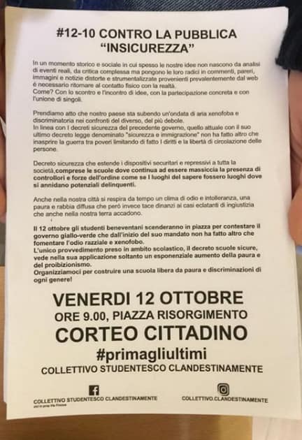 Intanto questa mattina sono stati distribuiti in tutte le scuole cittadine i volantini del corteo che invitano alla manifestazione. ”