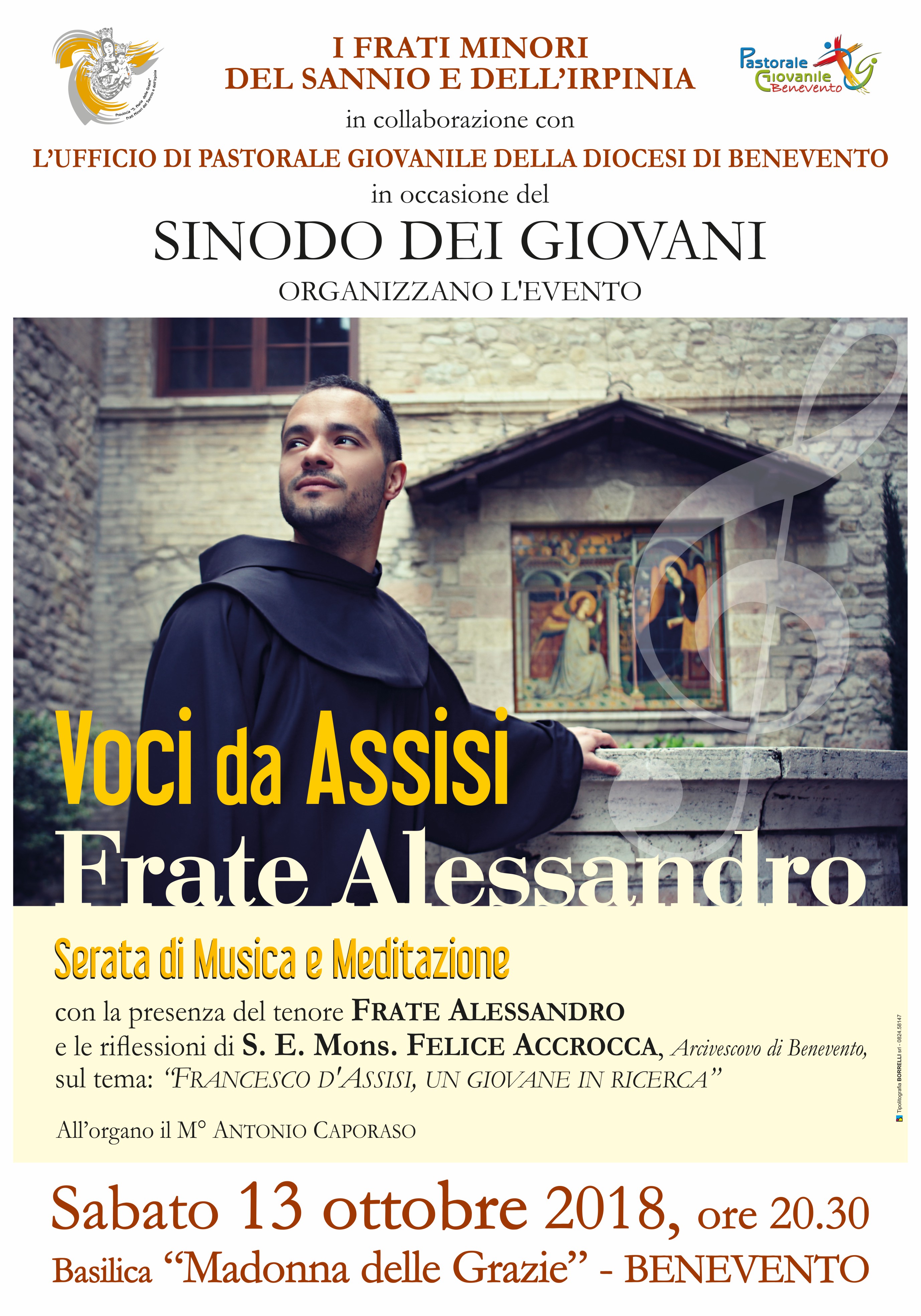 L’iniziativa è organizzata dalla provincia dei frati minori del Sannio e dell’Irpinia e dall’ufficio di pastorale giovanile dell’Arcidiocesi di Benevento. L’occasione del concerto di frate Alessandro Brustenghi, arricchito dalle meditazioni di Mons. Accrocca, è data dal Sinodo sui giovani che proprio in questo mese di ottobre si sta svolgendo in Vaticano, iniziativa fortemente voluta da Papa Francesco per porre al centro della riflessione e dell’impegno pastorale della Chiesa Universale proprio le nuove generazioni.