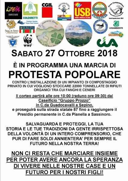 Il Comitato Civico “Rispetto e tutela del Territorio” ha indetto una nuova manifestazione per dire no alla costruzione dell’Impianto di compostaggio a Sassinoro. Il Comitato ha chiamato tutti a raccolta per sabato 27 ottobre per un corteo che partirà da contrada Guadocavalli nei pressi del Caseificio Prozzo di Sepino (Molise) per raggiungere attraversando la Statale 87 Sassinoro e contrada Pianella. A Sassinoro, già da tempo, è attivo un presidio permanente di protesta nell’area P.I.P. Un presidio nel quale protestare e sensibilizzare la popolazione e le autorità onde evitare la realizzazione di un impianto di compostaggio nel territorio.