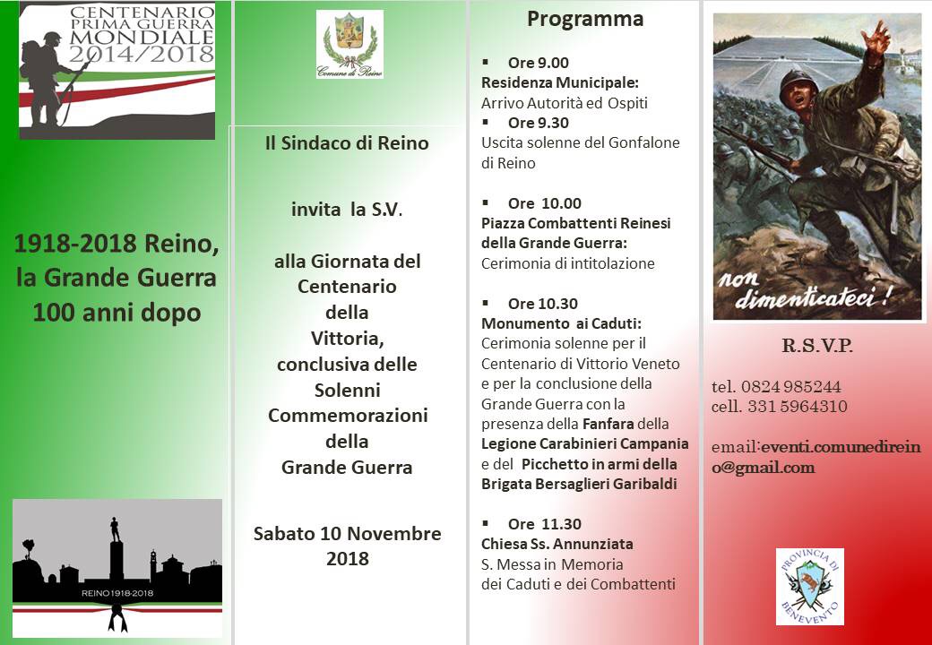 Il Comune di Reino, con il Patrocinio della Provincia di Benevento, in collaborazione con le associazioni Reinesi ha intrapreso, già dallo scorso mese di Maggio, numerose iniziative intese a conferire il massimo risalto alle Commemorazioni del Centenario della Grande Guerra, che hanno riscosso un grande successo in ambitoTerritoriale e non solo.