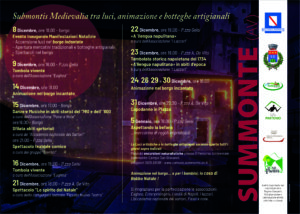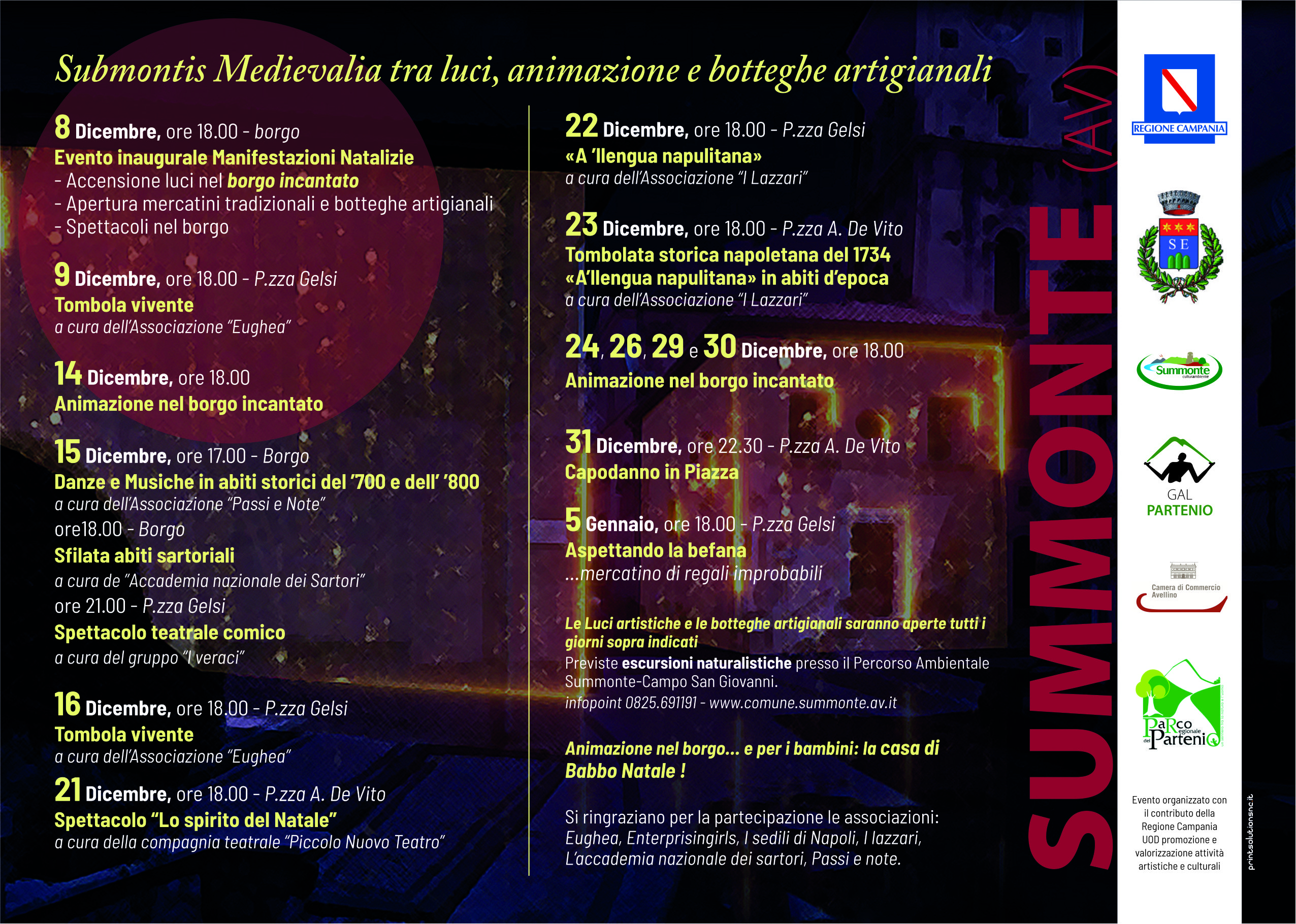 Il 16 dicembre alle ore 18 in piazza Gelsi con la Tombola vivente a cura dell’Associazione Eughea. Il 21 dicembre in piazza De Vito alle 18.00 lo spettacolo “Lo spirito del Natale” a cura della compagnia teatrale “Piccolo Nuovo Teatro”. Il 22 dicembre alle 18 in piazza Gelsi “A ‘lengua napulitana” a cura dell’Associazione “I Lazzari” mentre il 23 dicembre, sempre alle 18.00 e nella stessa location in piazza De Vito “Tombola storica napoletana del 1734 “A ‘lengua napulitana” in abiti d’epoca a cura dell’Associazione “I Lazzari”. Il 24, 26, 29 e 30 dicembre prevista animazione nel borgo. Il 31 dicembre a partire dalle 22.30 in piazza De Vito “Capodanno in piazza”. Il ricco programma di appuntamenti di Submontis Medievalia si chiude il 5 gennaio con “Aspettando la befana….il mercatino dei regali improbabili”.