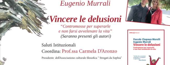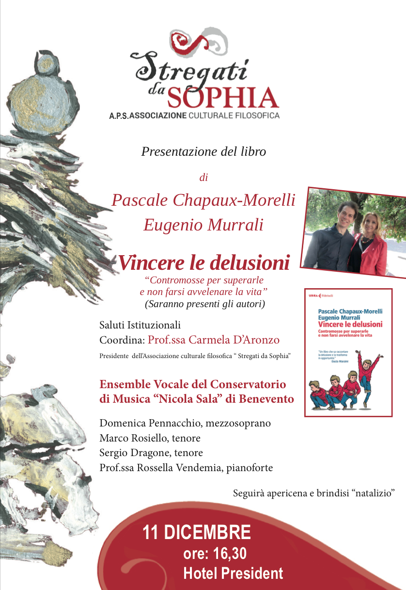 L’Associazione culturale filosofica “ Stregati da Sophia”,ospiterà martedi 11 dicembre 2018, alle ore 16,30 presso il Presidente Hotel, Pascale Chapaux-Morelli e Eugenio Murrali che presenteranno il libro “Vincere le delusioni .Contromosse per superarle e non farsi avvelenare la vita”