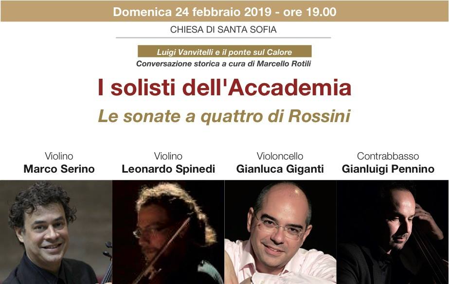 Domenica 24 febbraio, ore 19, nella chiesa di Santa Sofia a Benevento, appuntamento previsto con i Solisti dell’Accademia in “Le sonate a quattro di Rossini”.